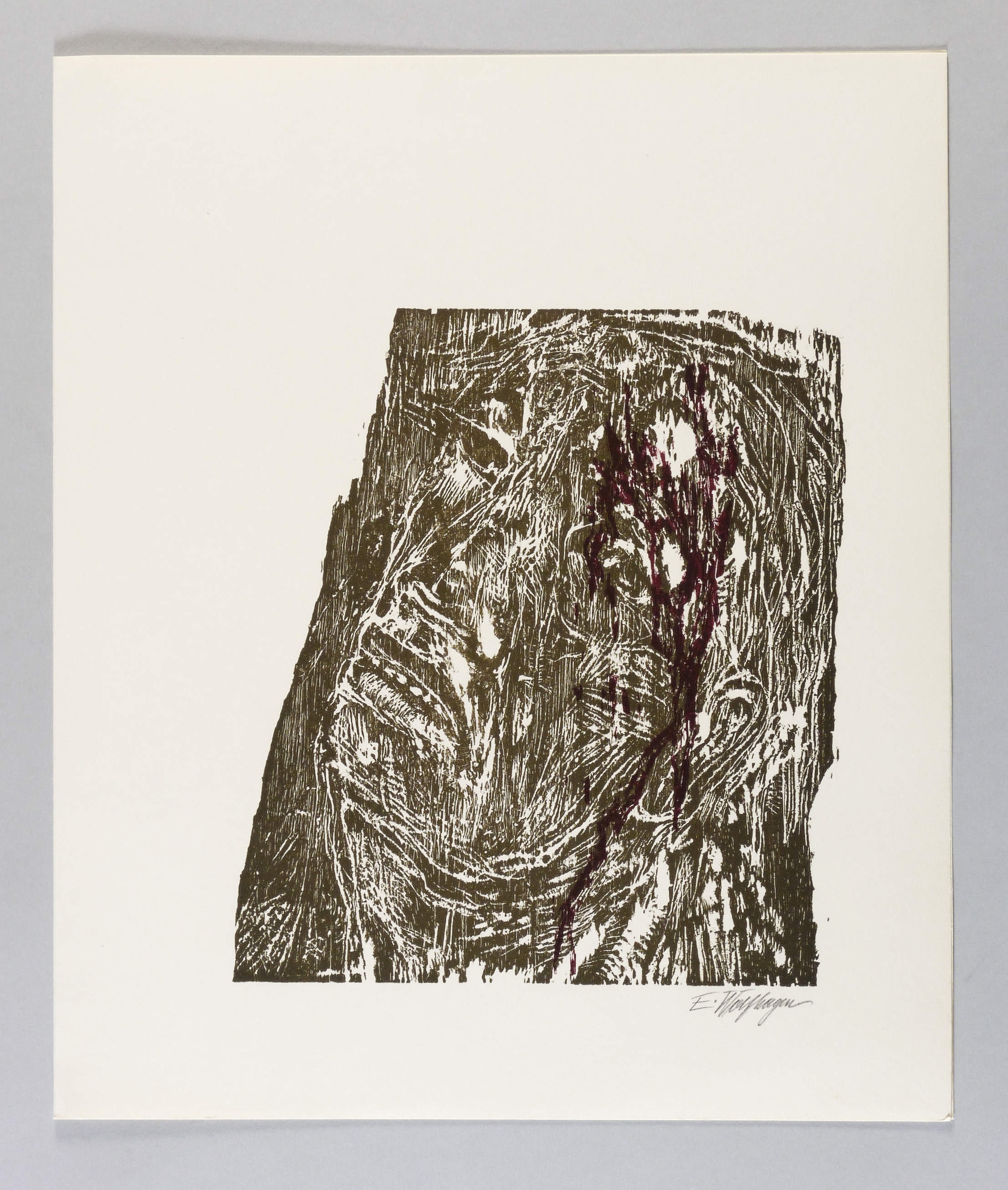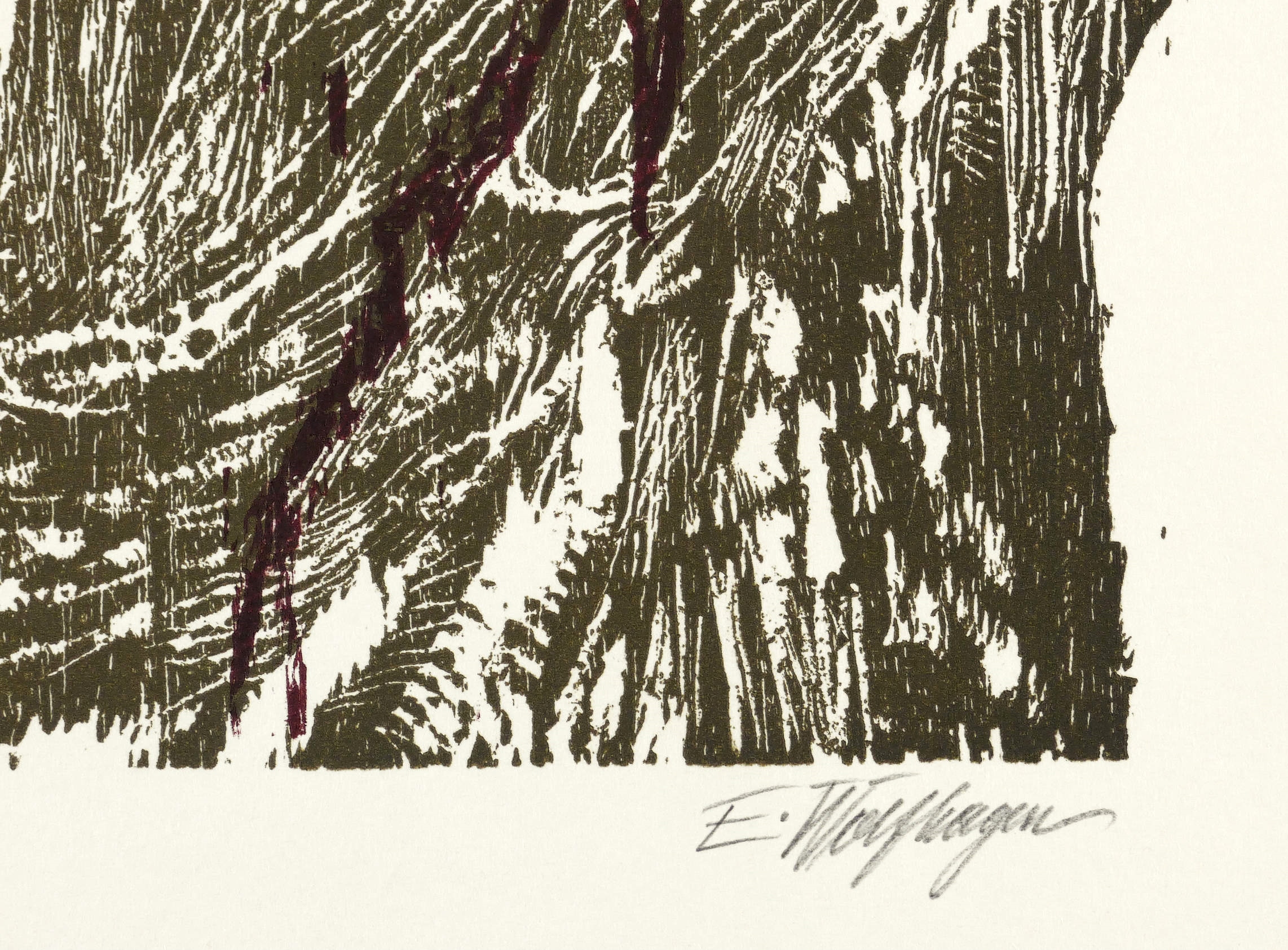 1968. Farbholzschnitt, in Graubraun & Rotbraun, auf hellgelbem Velinkarton. – Originale Künstlergrafik, von Ernst Wolfhagen. – 24,0 x 21,8 cm (Darstellung / Druckstock), 38 x 32 cm (Blätter).