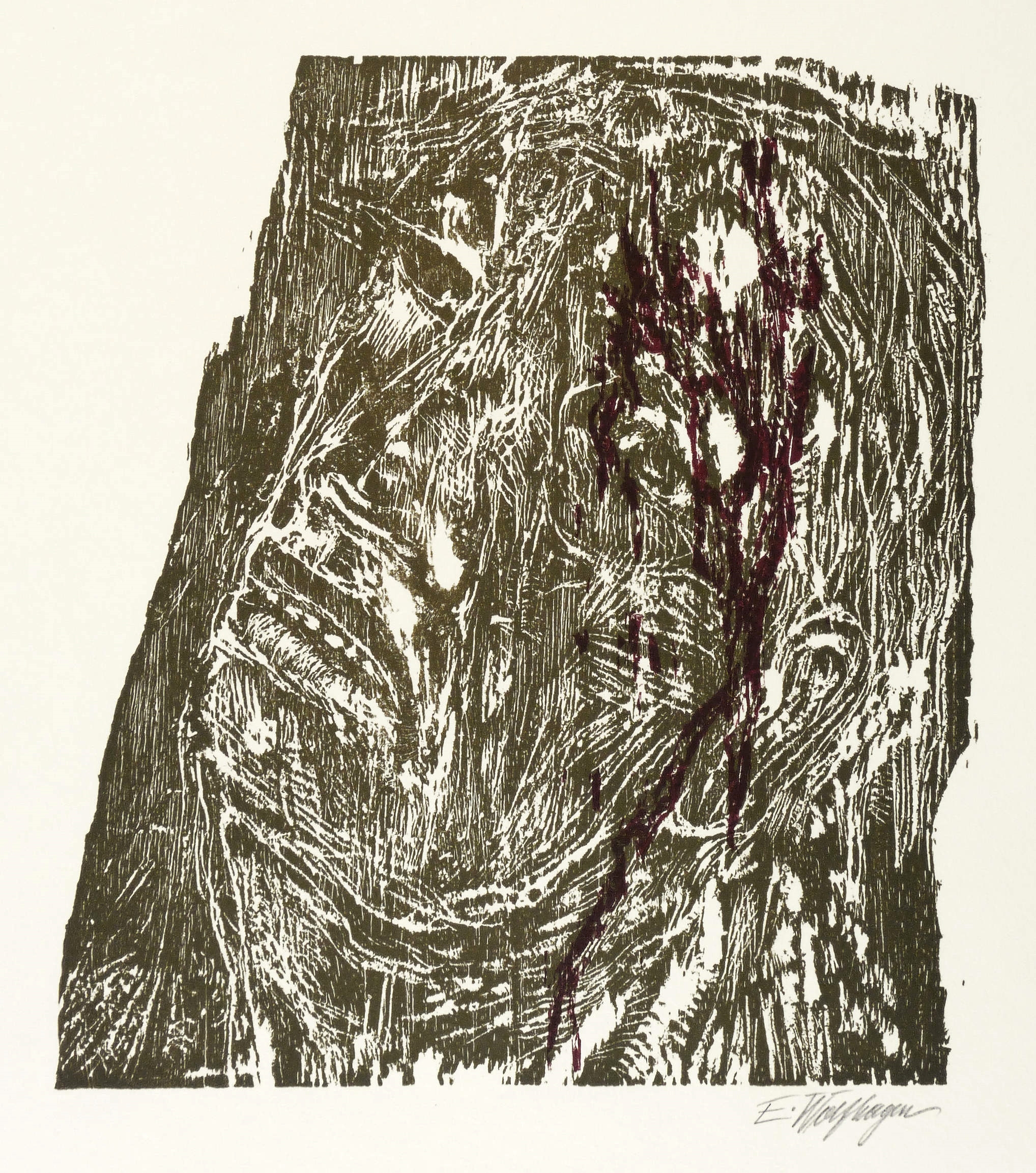Aus: Flamme, Durst und Schrei. Farbholzschnitte zu expressionistischer Lyrik (Hannover: Werkkunstschule 1968). – Rechts unten in Bleistift signiert: ″E. Wolfhagen″. Auf der Doppelseite typografischer Text: ″Iwan Goll / Mond (IV) // Und eines Nachts troff Blut auf unser Antlitz; / Dein Blut, zu unsres Krieges Blut gemischt, / Rann um die Erde wie ein runder Ring. // (...)″. – Zu einem Gedicht des deutsch-französischen Schriftstellers Iwan Goll (1891-1950). – Tadellos. Vollständig mit dem Textblatt. Sehr guter Zustand.