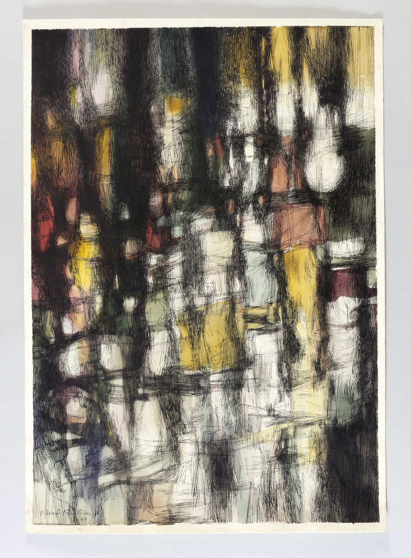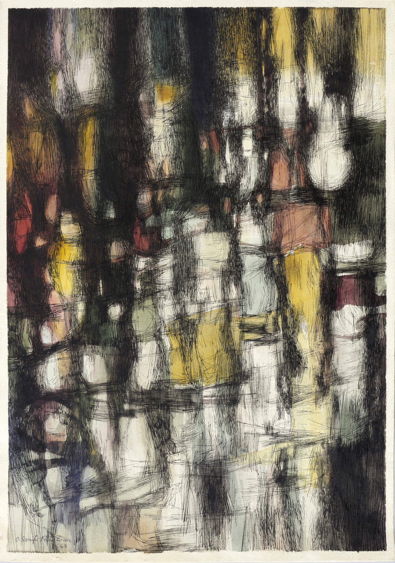 1963. Mischtechnik / Tusche & Aquarell, auf Aquarellkarton. – Originale Künstlergrafik, von Olga Szaif-Pawlowa. – Unikat. – 48,0 x 33,7 cm (Darstellung), 49,7 x 35,1 cm (Blatt).