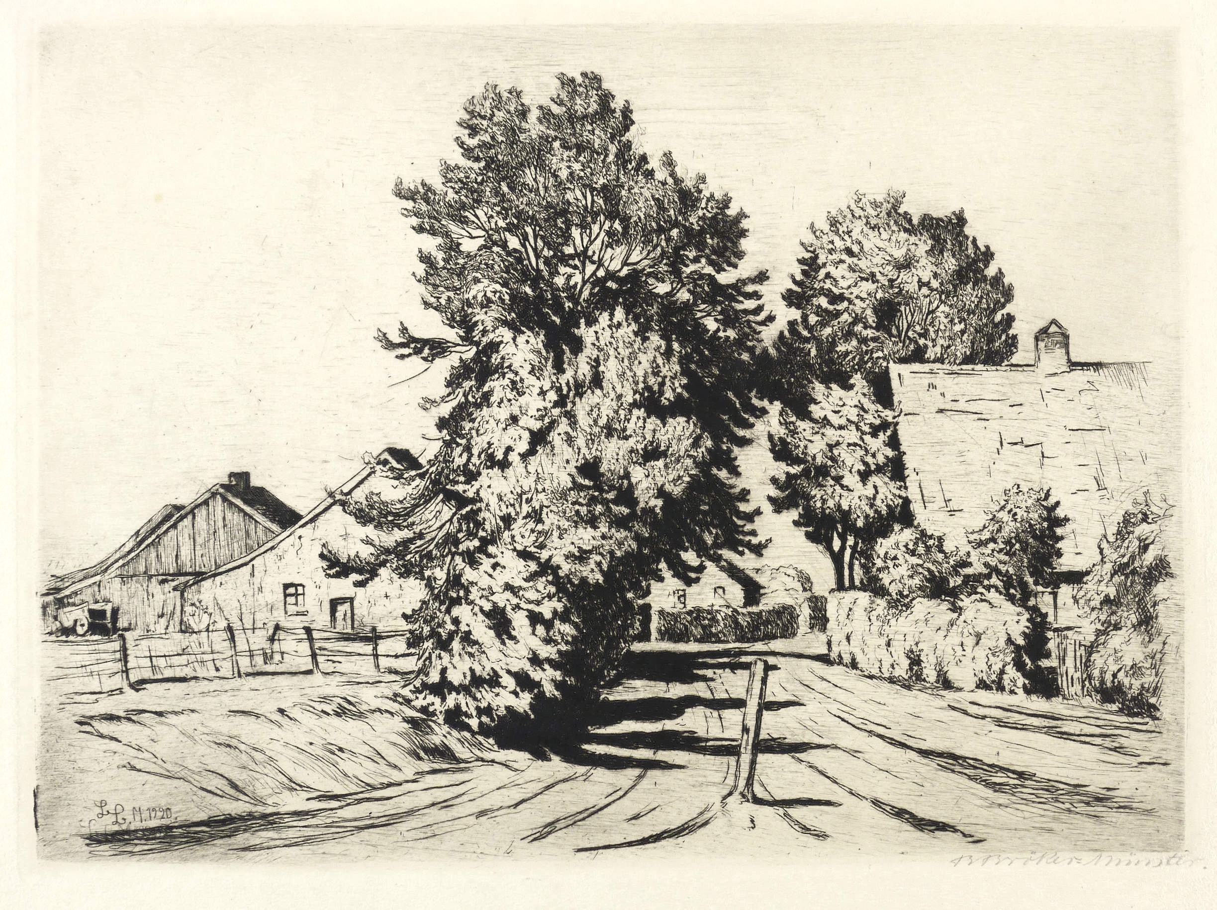 1920. Radierung / Kaltnadel, in Schwarz, auf schwerem gelbem Kupferdruckpapier. – Originale Künstlergrafik, von Bernhard Bröker-Münster. – 22,8 x 31,5 cm (Darstellung / Platte), 37 x 45 cm (Blatt).