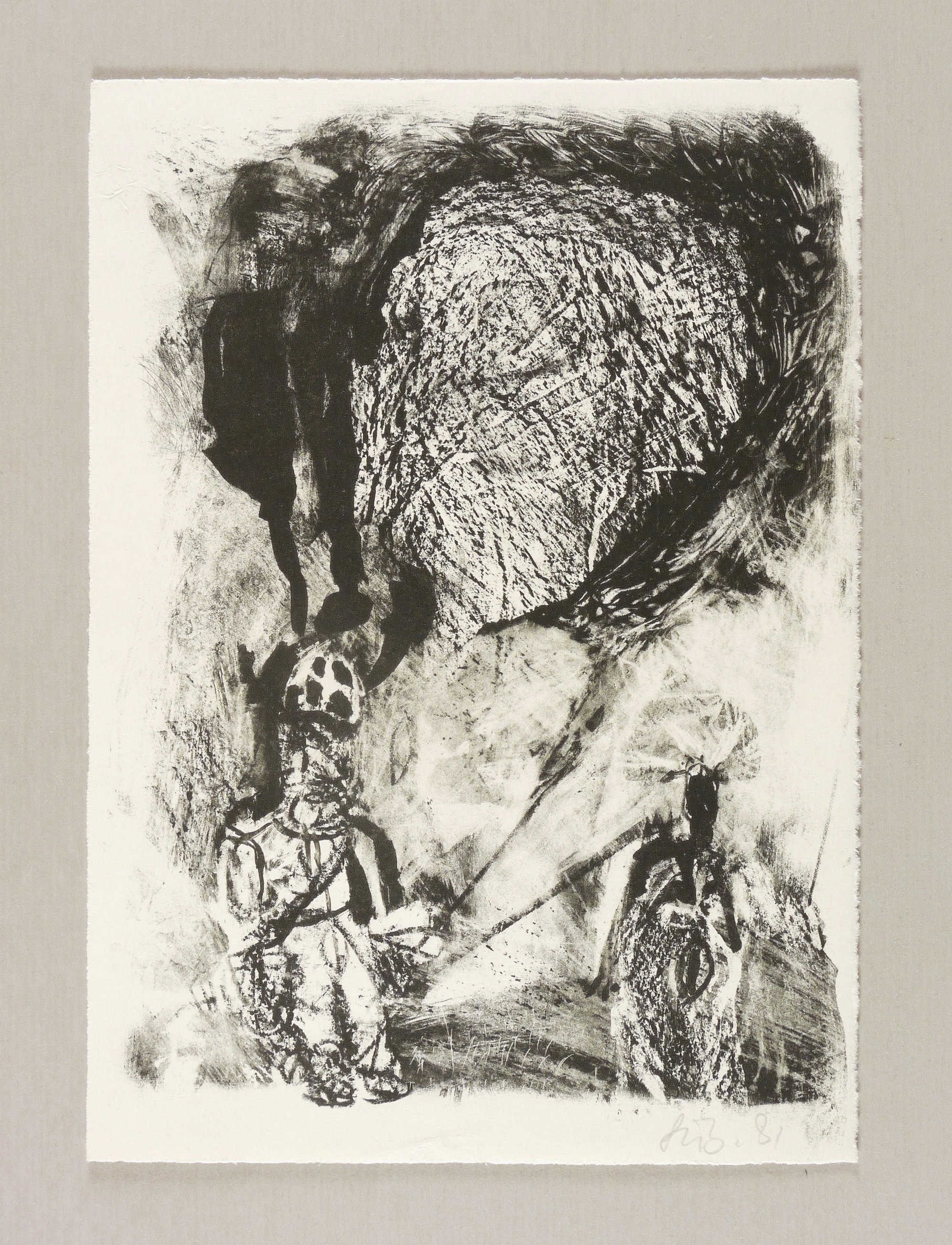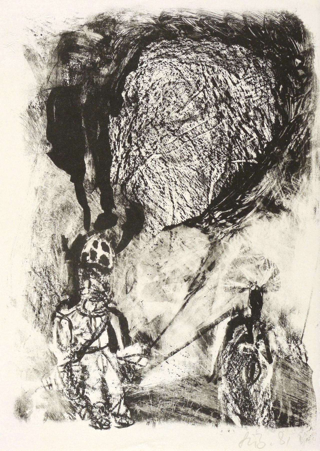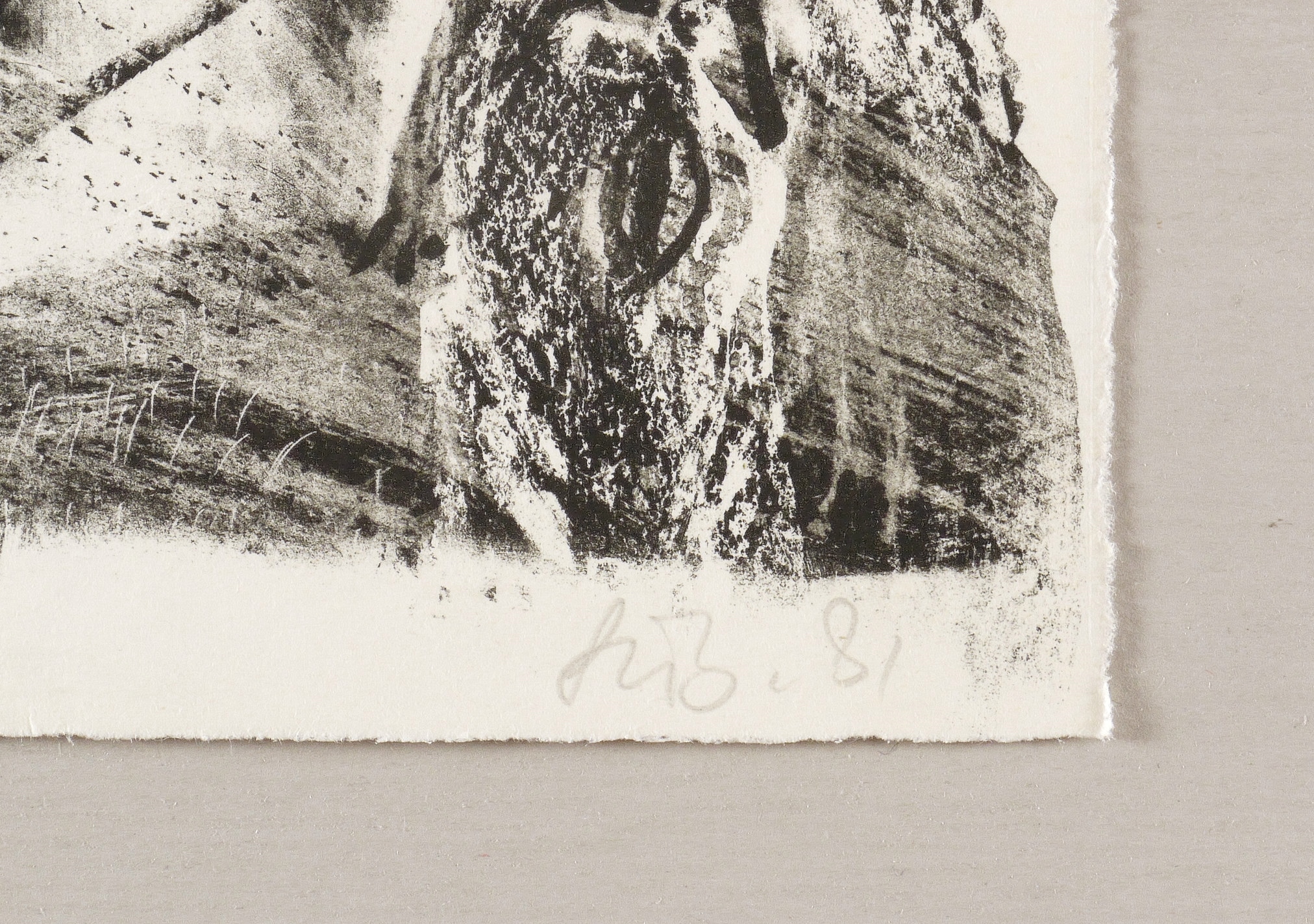 1981. Lithografie / Kreide- & Pinsellithografie, geschabt, in Schwarz, auf hellchamois Velin. – Originale Künstlergrafik, von Werner Liebmann. – 22,0 x 16,7 cm (Darstellung / Druckbild), 24 x 17 cm (Blatt).