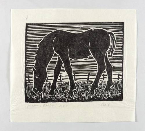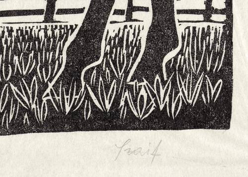 1954. Linolschnitt, in Schwarz, auf gelblichem Japanpapier. – Originale Künstlergrafik, von Peter Szaif. – 14,1 x 17,4 cm (Darstellung / Druckstock), 20 x 22 cm (Blatt).