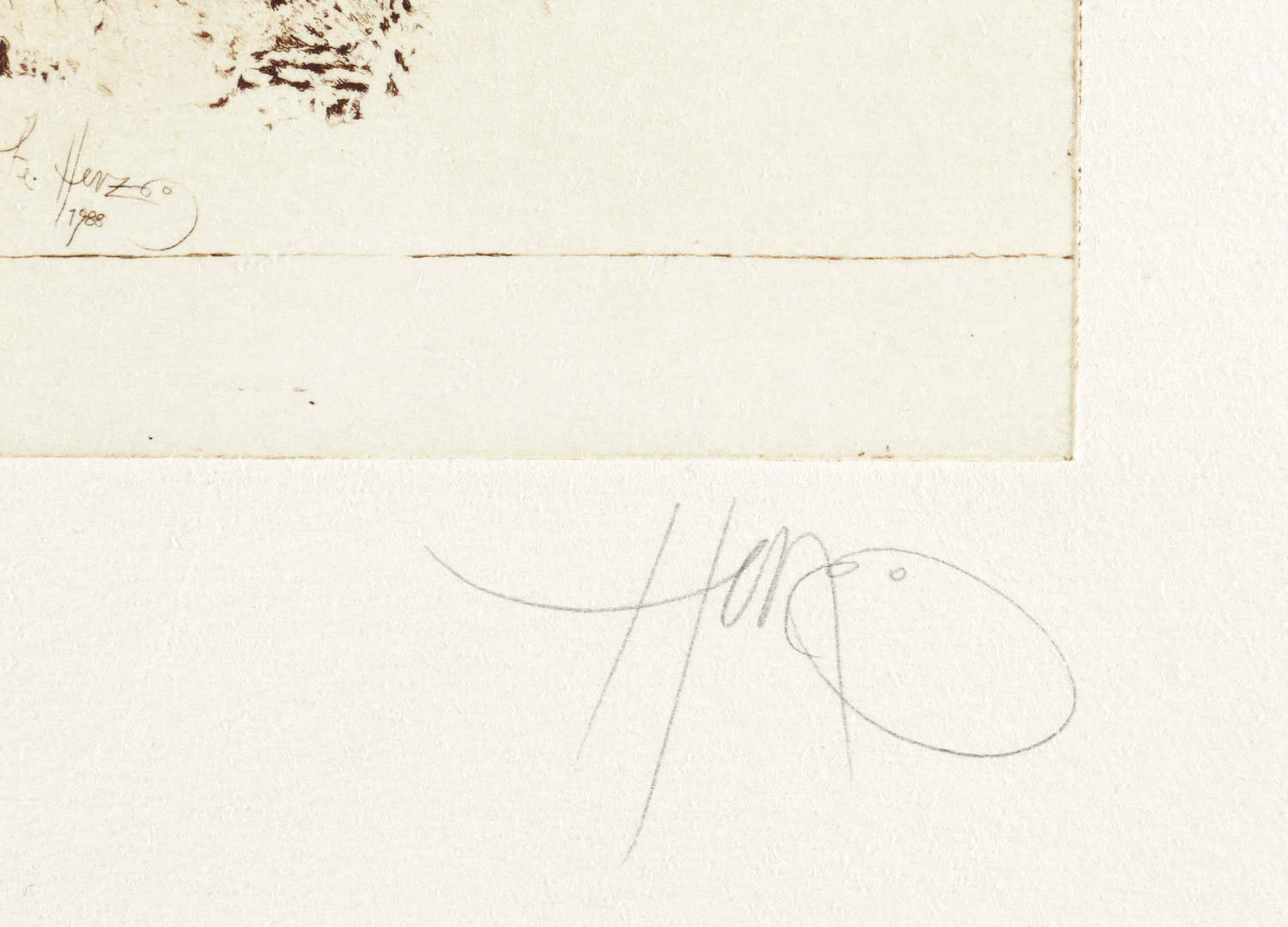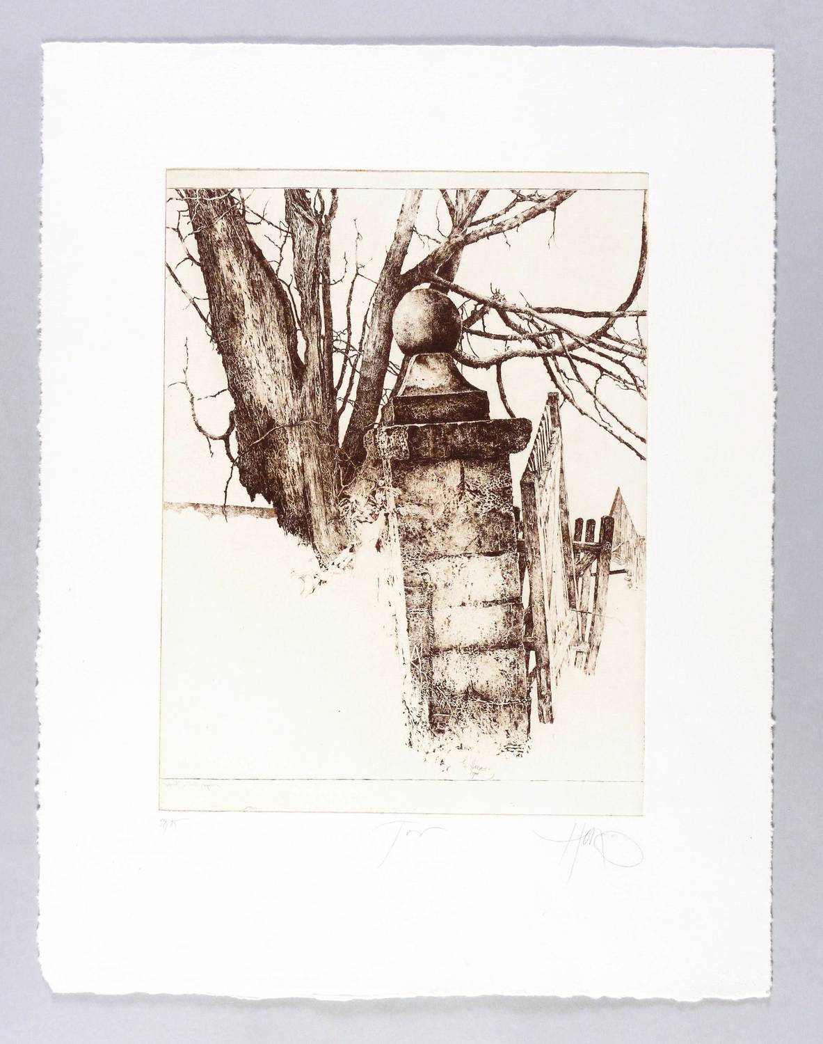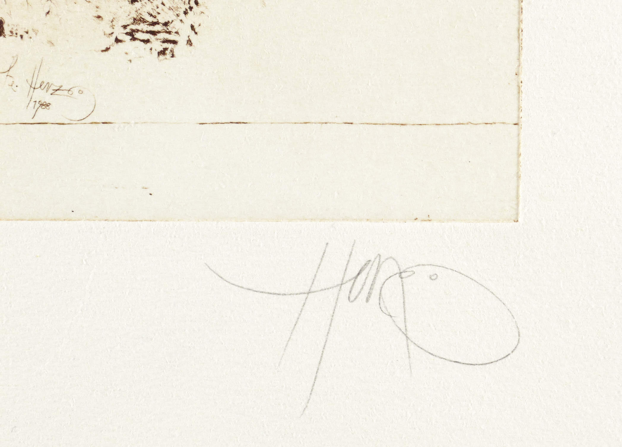 1988. Radierung / Strichätzung, mit zartem Plattenton, in Sepiabraun, auf hellem Büttenkarton. – Von Walter Herzog. – Auflage Exemplar Nr. 59/75. – 28,9 x 21,6 cm (Darstellung / Platte), 43 x 34 cm (Blatt).