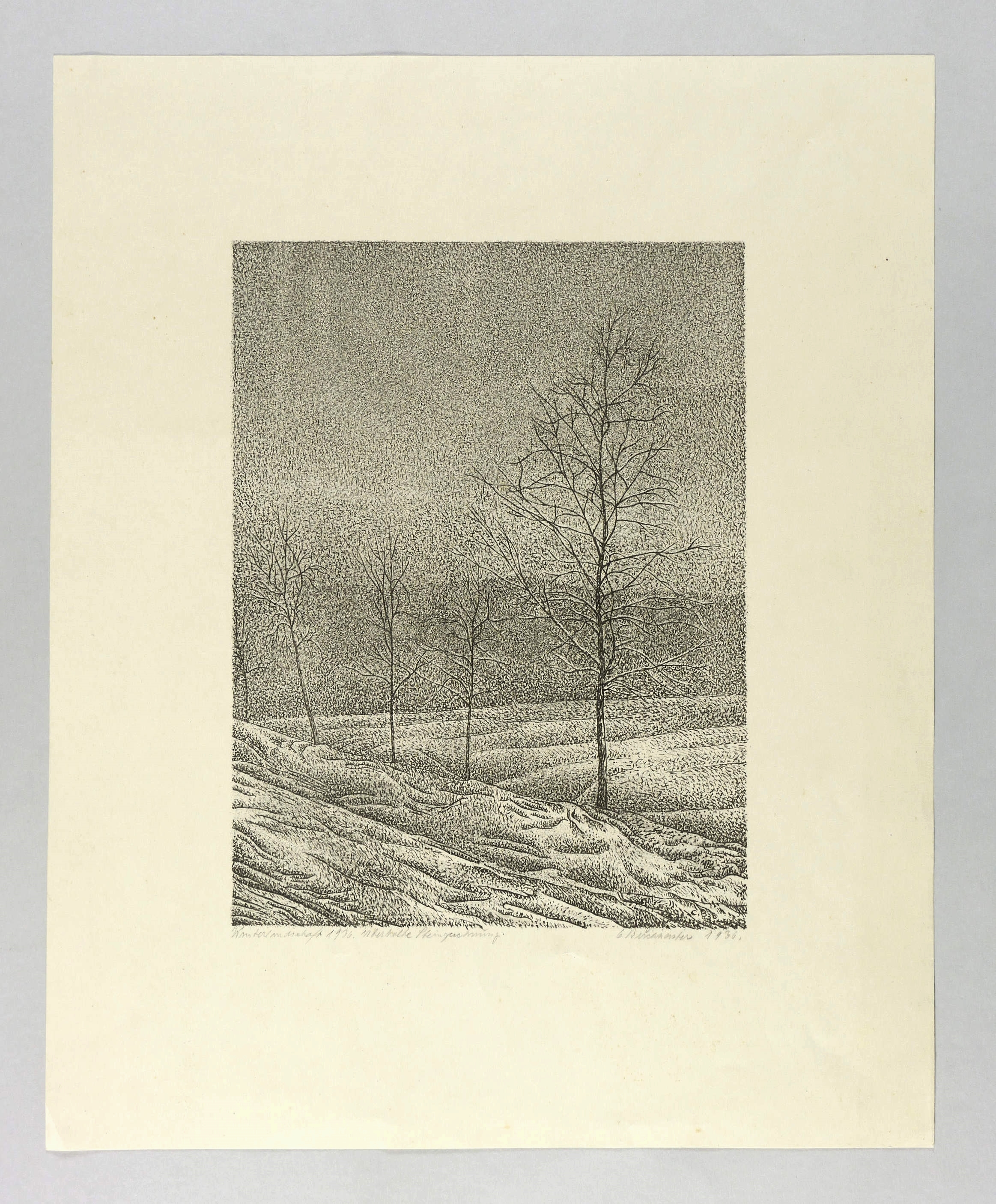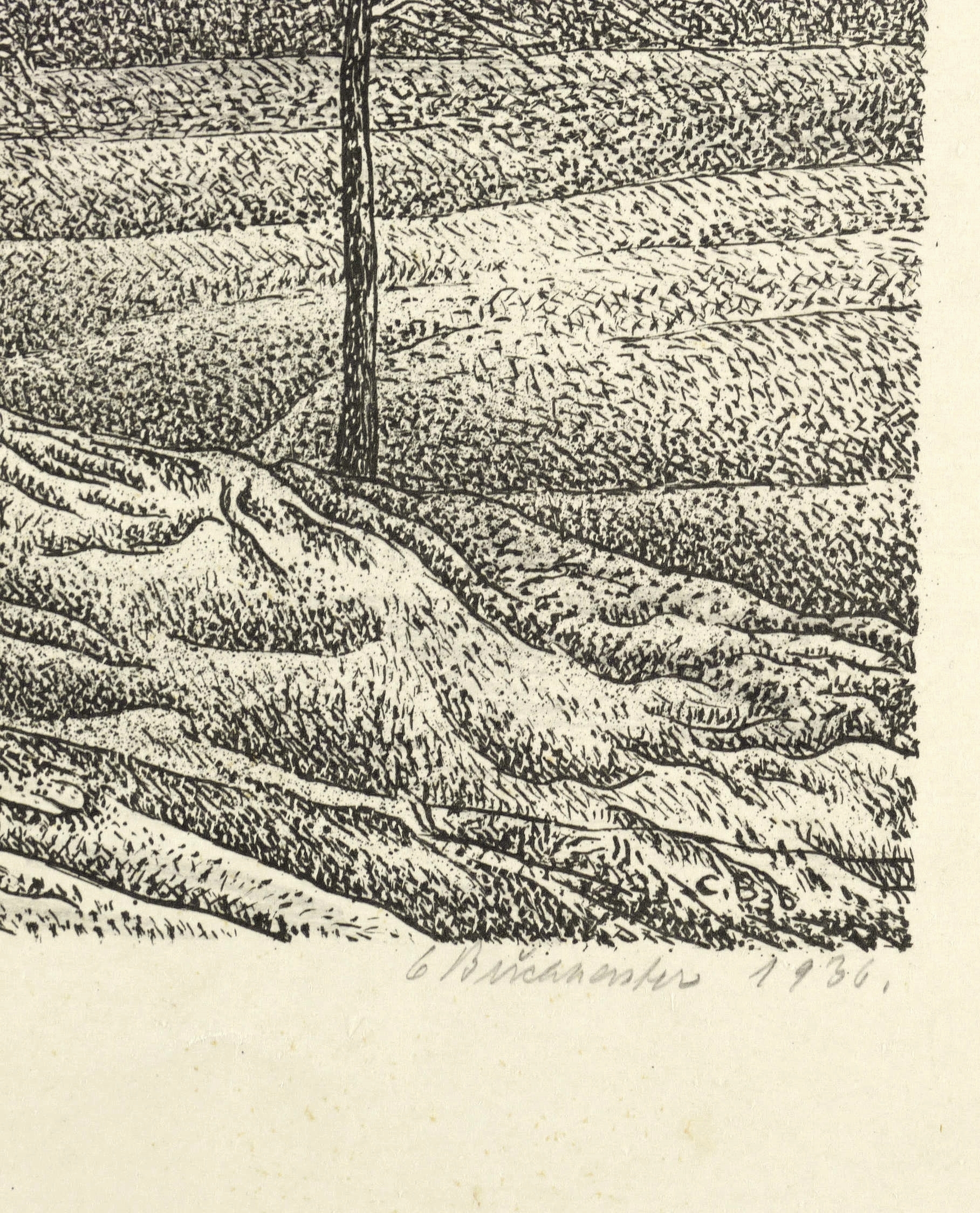 Rechts unten in Bleistift signiert und datiert: ″C Buchheister 1936.″ Links bezeichnet: ″Winterlandschaft 1936. überholte Steinzeichnung.″ Im Stein rechts unten zusätzlich Signatur und Jahr. – Seltene gegenständliche Arbeit aus der Zeit der Unterdrückung und Isloation durch das NS-Regime. – Schönes breitrandiges Exemplar. Papier mit geringfügigen, kaum merklichen Fleckchen und Knickspuren. Sehr kleines Eselsohr links unten. Insgesamt durchaus guter bis sehr guter Erhaltungszustand.