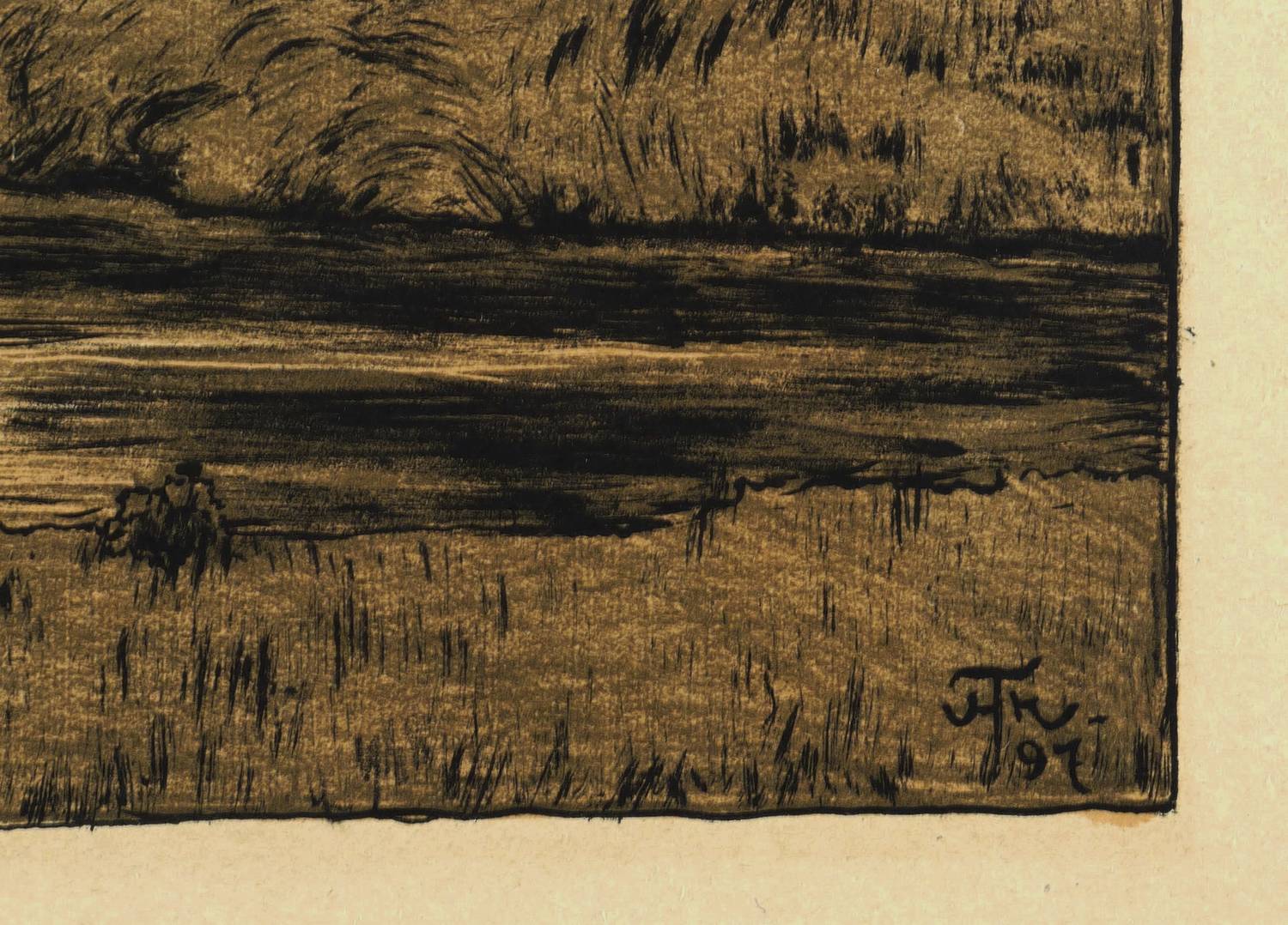 1897. Farblithografie / Feder-, Kreide- & Pinsellithografie, in Hellrot, Schiefergrün & Schwarz, auf gelbem Büttenkarton. – Originale Künstlergrafik, von Hans Thoma. – 25,2 x 48,4 cm (Darstellung / Druckbild), 43 x 54 cm (Blatt).