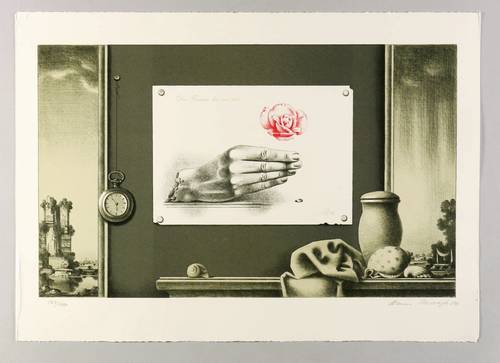 Rechts unten in Bleistift signiert und datiert. Links Auflagenbezeichnung. Im Stein links oberhalb der Rosenblüte Titel. In der Blattecke links unten Trockenstempel des Druckers. – Druck von Quensen, Lahmspringe. – Kaum erhebliche Quetschfalten im äußeren linken Rand. Insgesamt gut erhalten.