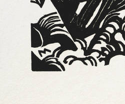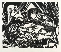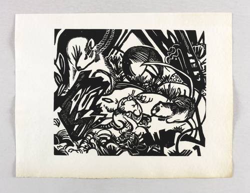 1912. Holzschnitt, in Schwarz, auf hellem Maschinenpapier. – Originale Künstlergrafik, von Franz Marc. – 20,1 x 24,1 cm (Darstellung / Druckstock), 26 x 35 cm (Blatt).