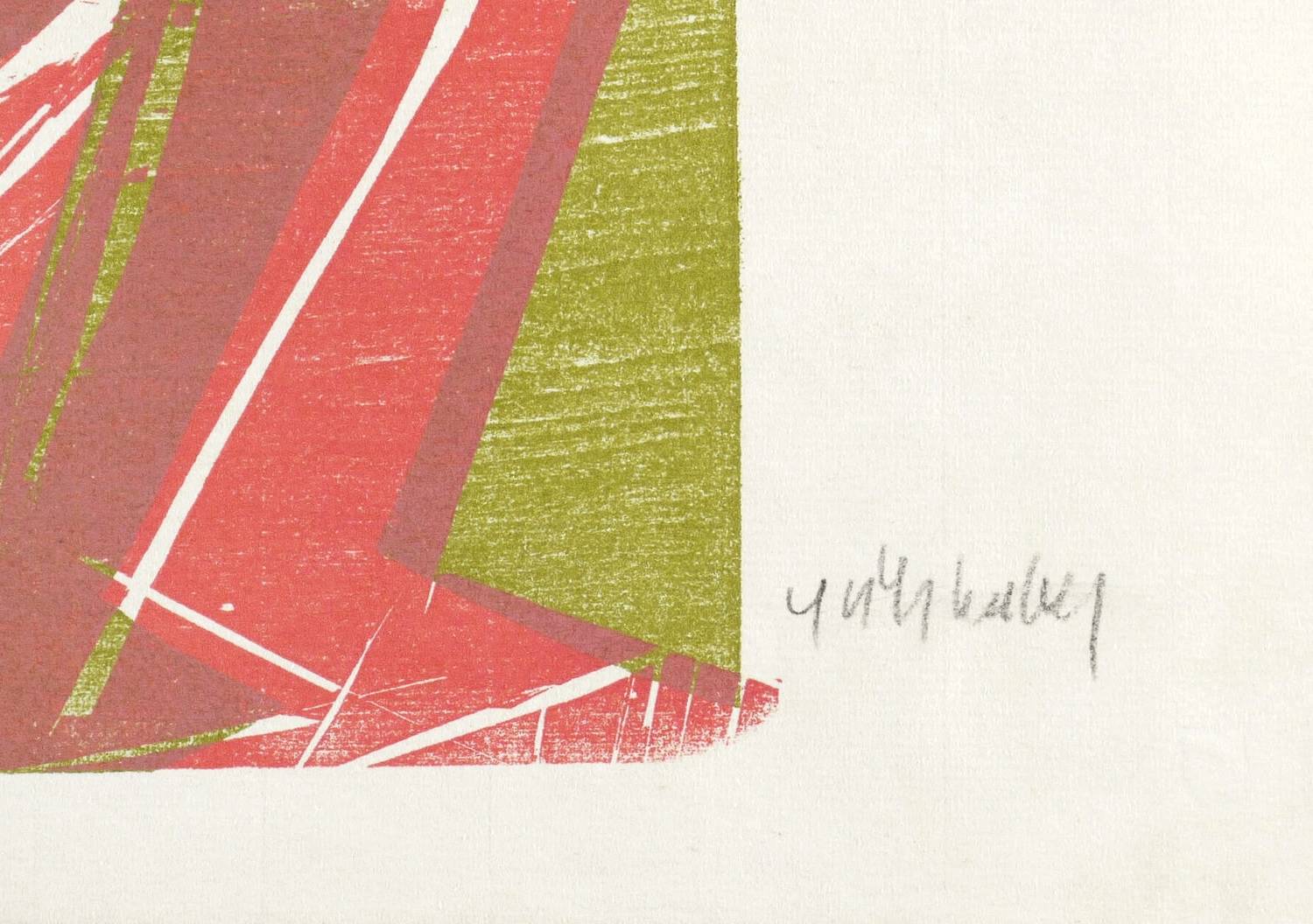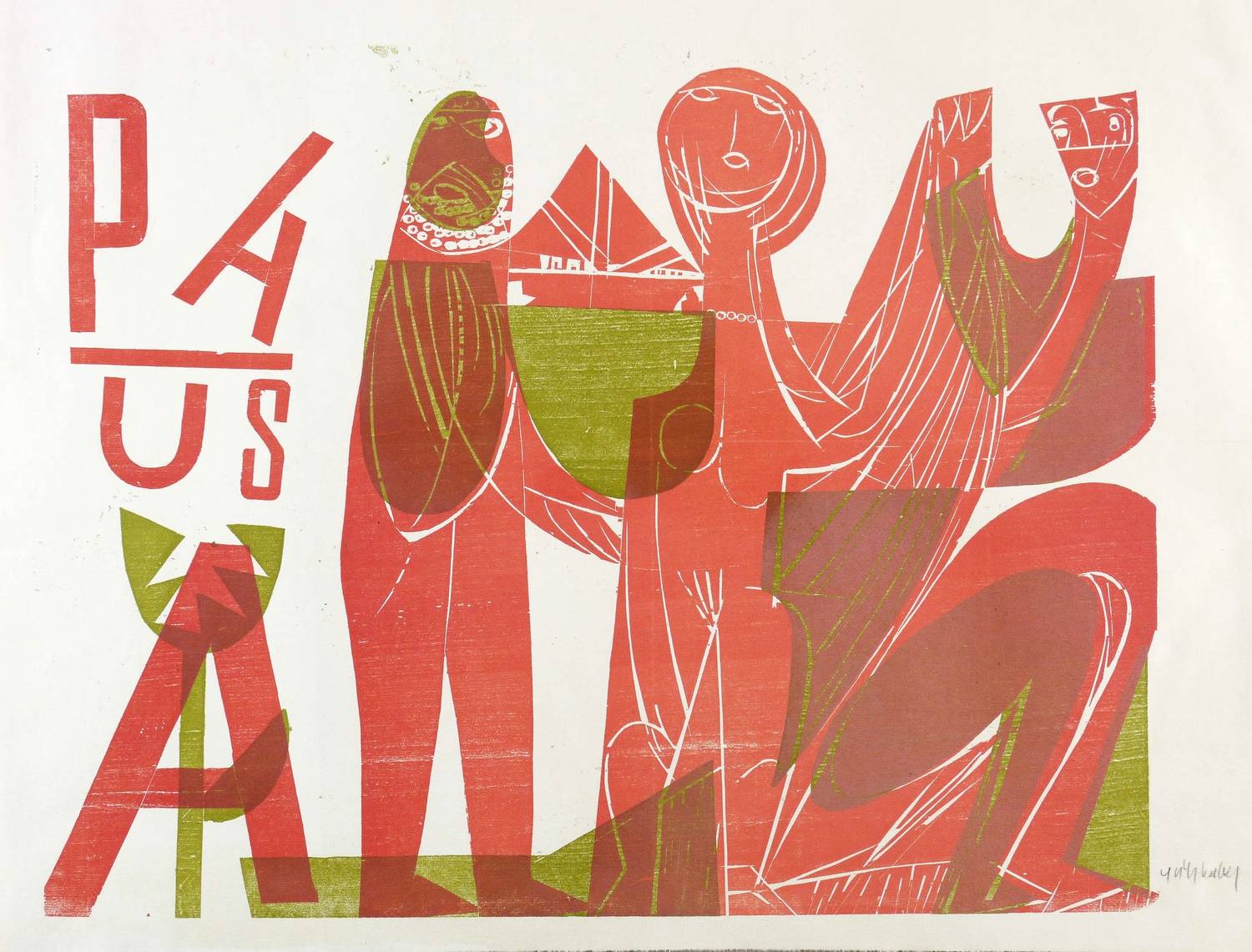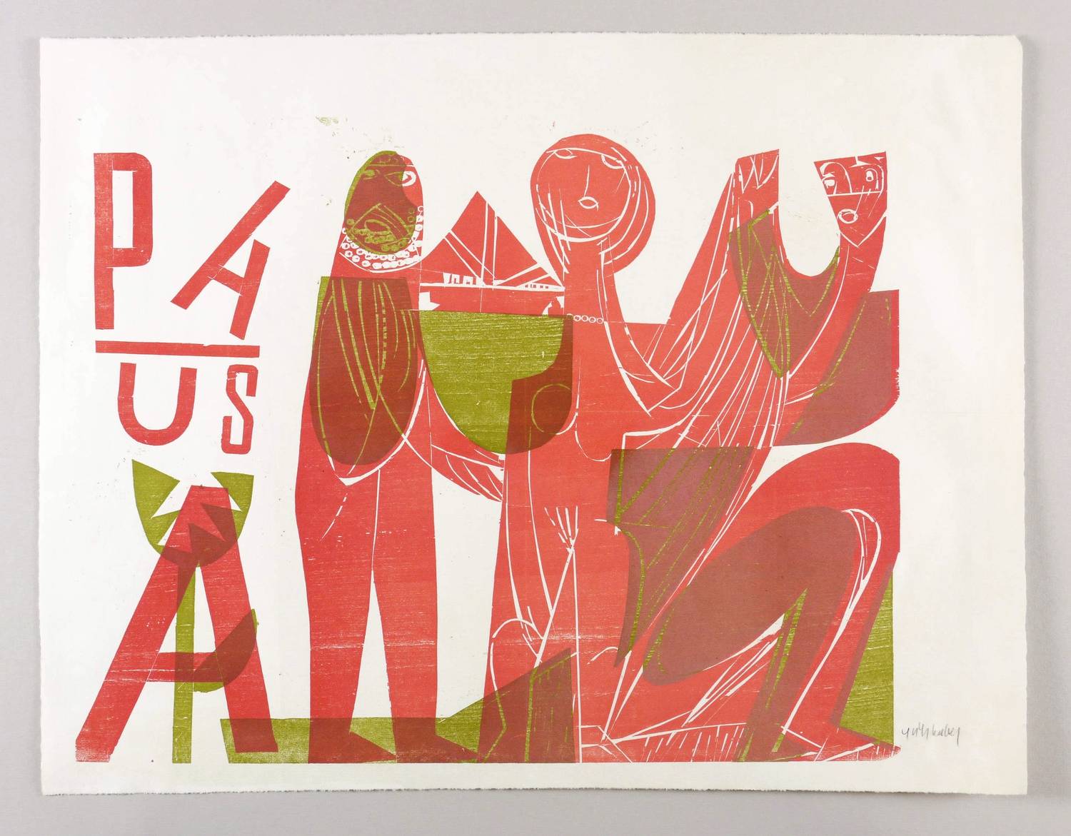 1961. Farbholzschnitt, in Violettorange & Grün, auf feinem Hahnemühle-Bütten. – Originale Künstlergrafik, von HAP Grieshaber. – Auflage 500 Exemplare. – 40,6 x 52,2 cm (Darstellung / Druckbild), 49 x 64 cm (Blatt).
