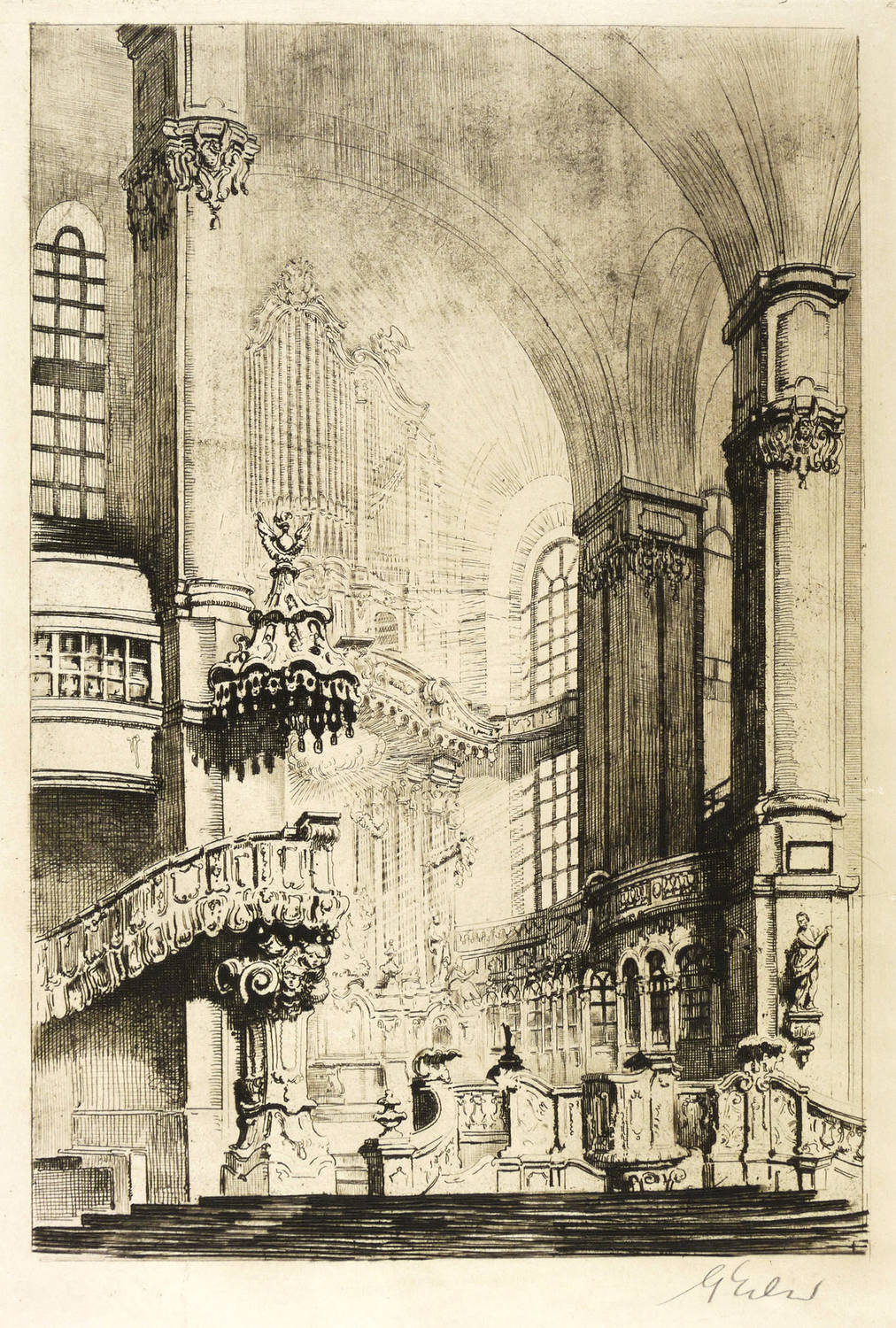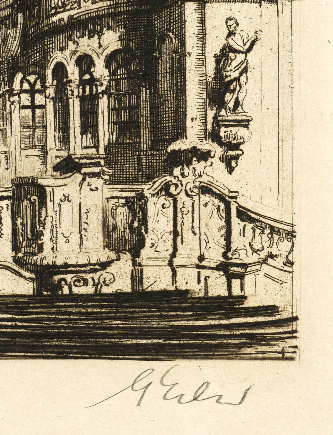 1920-1925. Radierung / Strichätzung, in Schwarz, auf leichtem gelbem Kupferdruckpapier. – Originale Künstlergrafik, von Georg Erler. – 31,3 x 21,1 cm (Darstellung), 36,8 x 24,6 cm (Platte), 43 x 30 cm (Blatt).