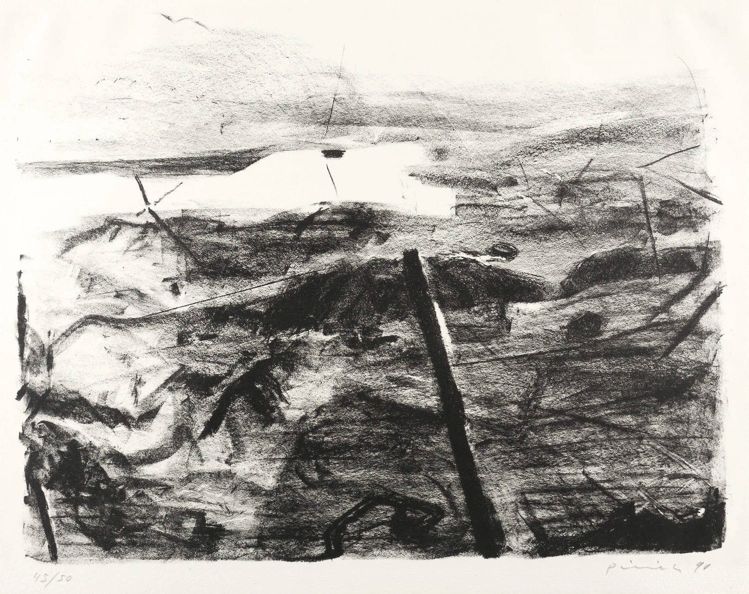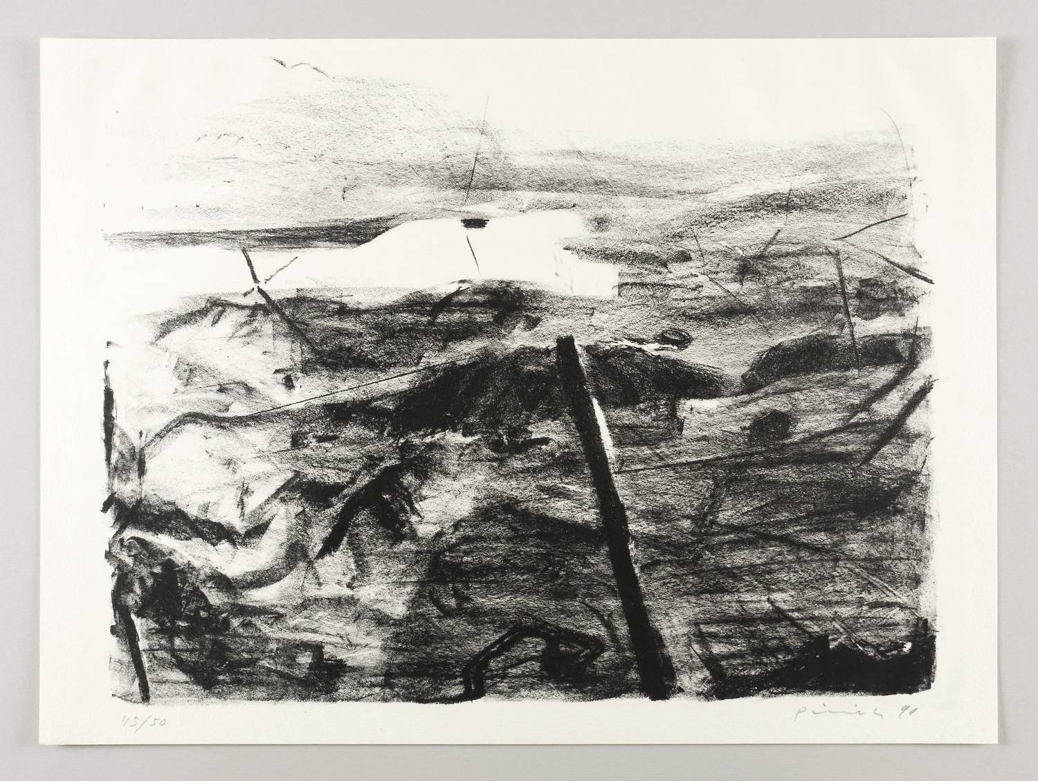 1990. Lithografie / Kreidelithografie, in Schwarz, auf hartem hellgelbem Velin. – Originale Künstlergrafik, von Hartmut Piniek. – Auflage Exemplar Nr. 45/50. – 36,2 x 47,1 cm (Darstellung), 40 x 54 cm (Blatt).