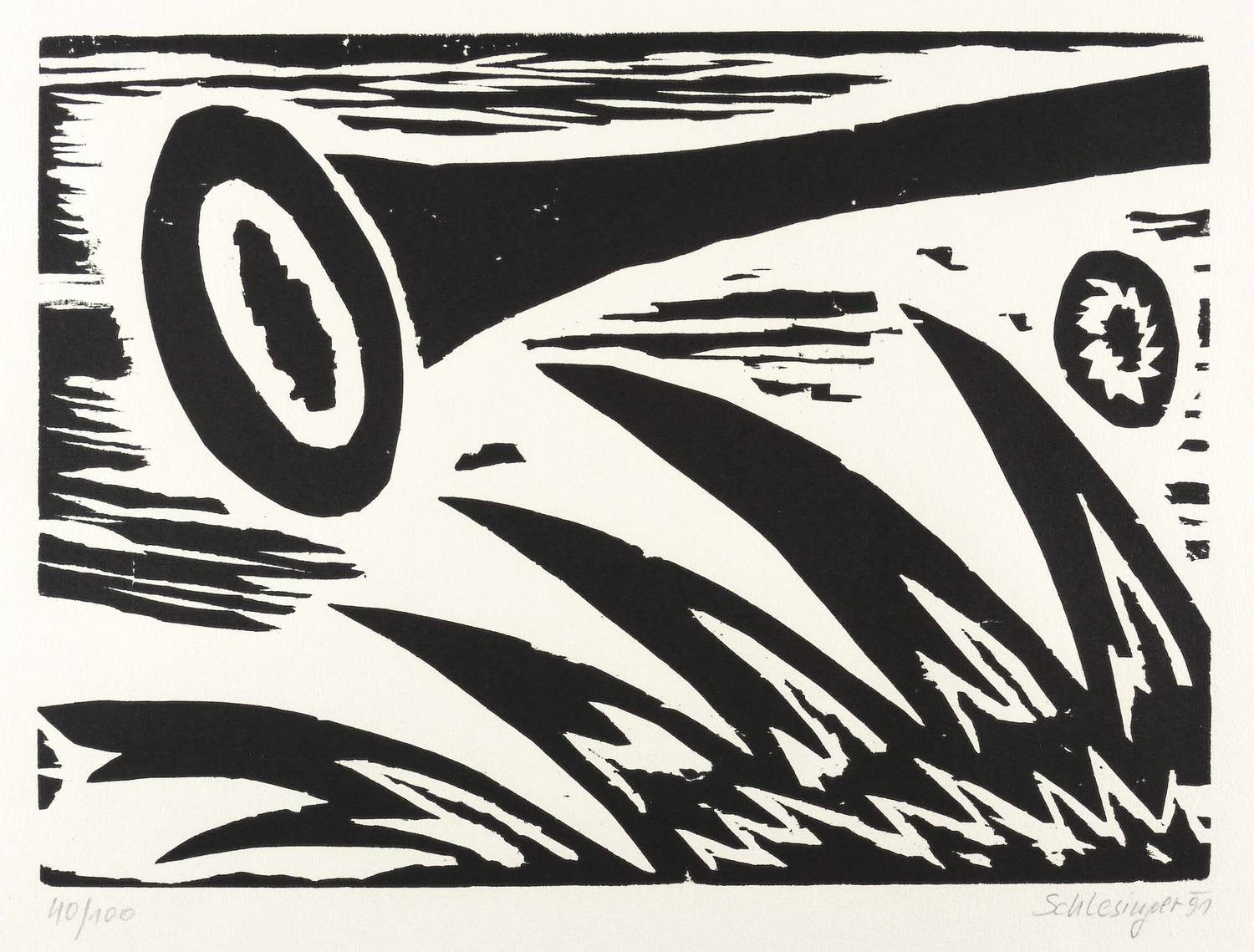 1991. Holzschnitt, in Schwarz, auf hellchamois Arches-France-Bütten. – Originale Künstlergrafik, von Gil Schlesinger. – Auflage Exemplar Nr. 40/100. – 29,5 x 40,4 cm (Darstellung / Druckbild), 45 x 56 cm (Blatt).