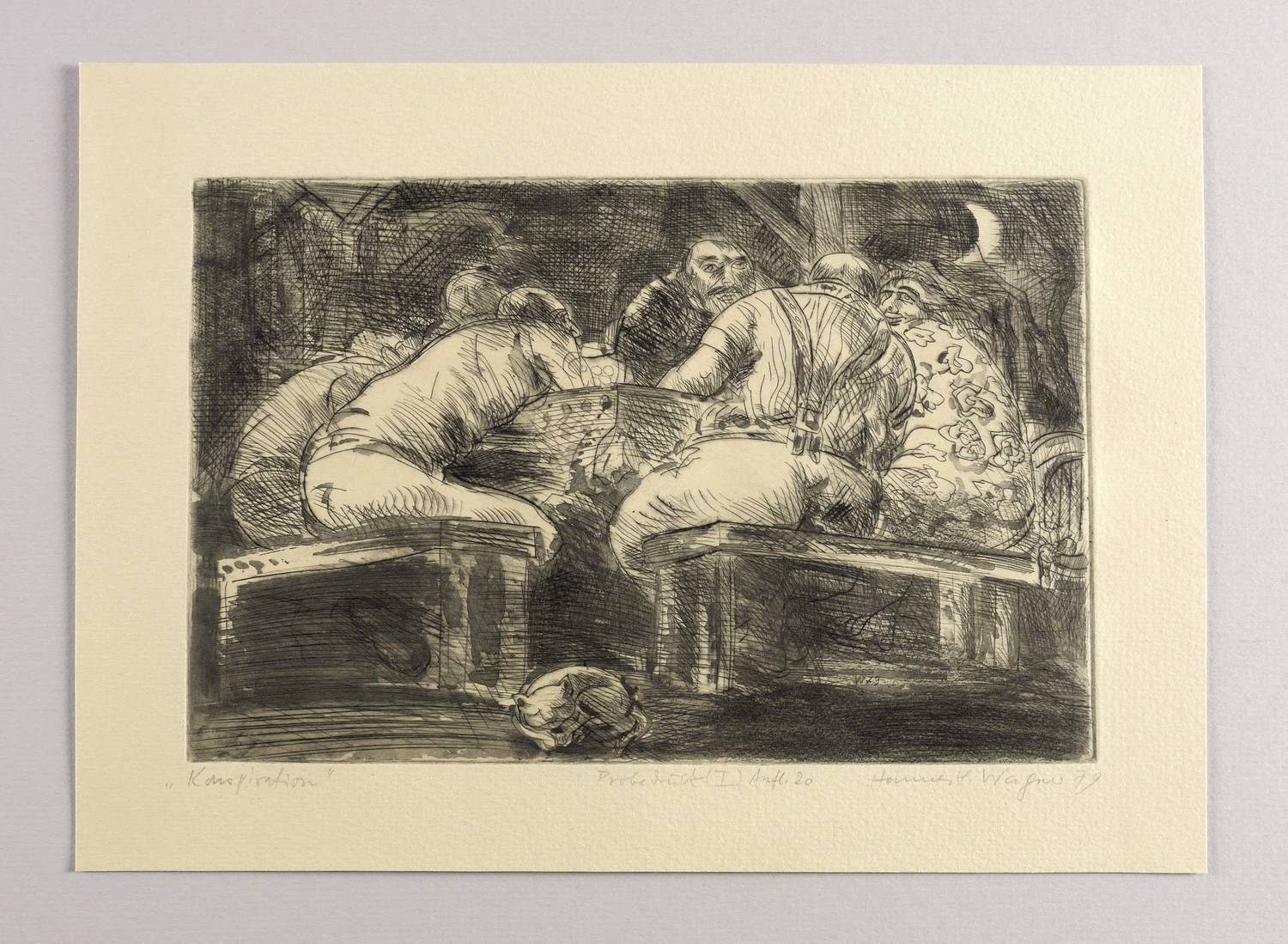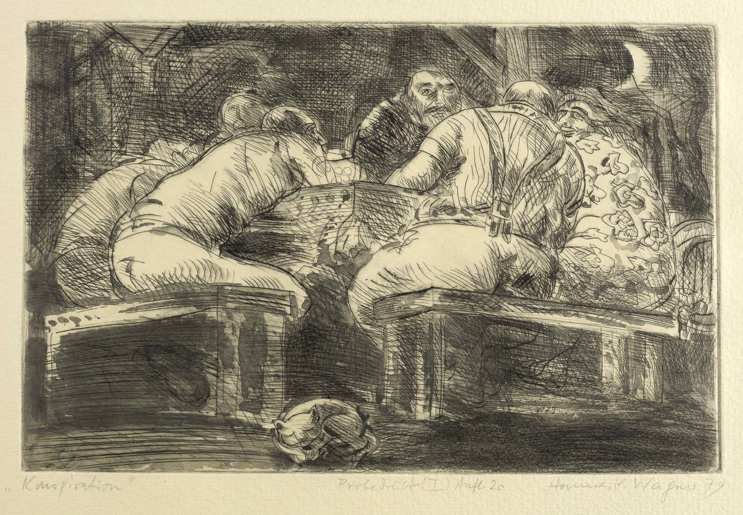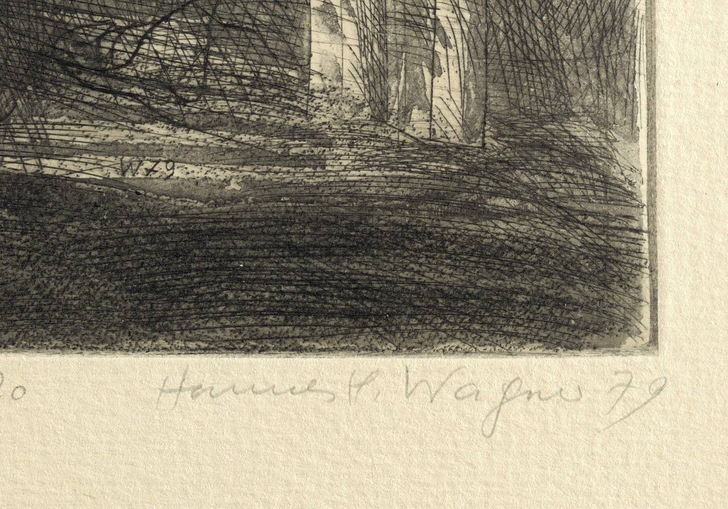 1979. Radierung / Strichätzung & Aquatinta, in Schwarz, auf gelbem Velinkarton. – Originale Künstlergrafik, von Hannes H. Wagner. – Probedruck. – 16,1 x 24,5 cm (Darstellung / Platte), 23 x 31 cm (Blatt).