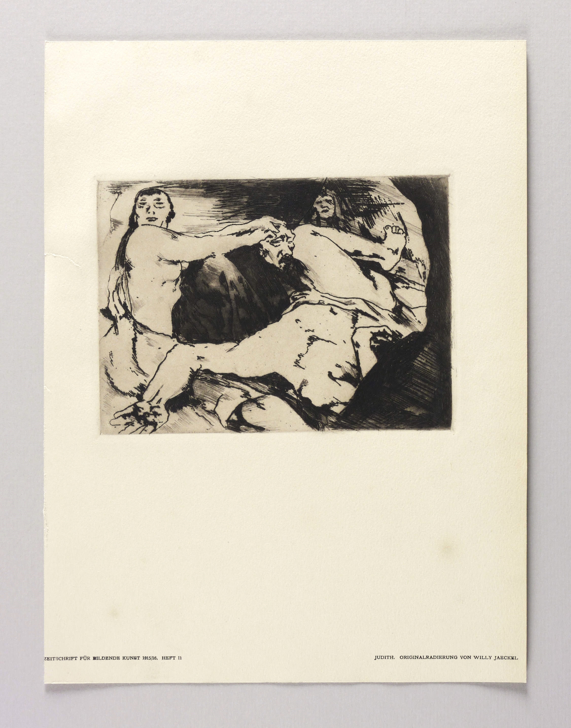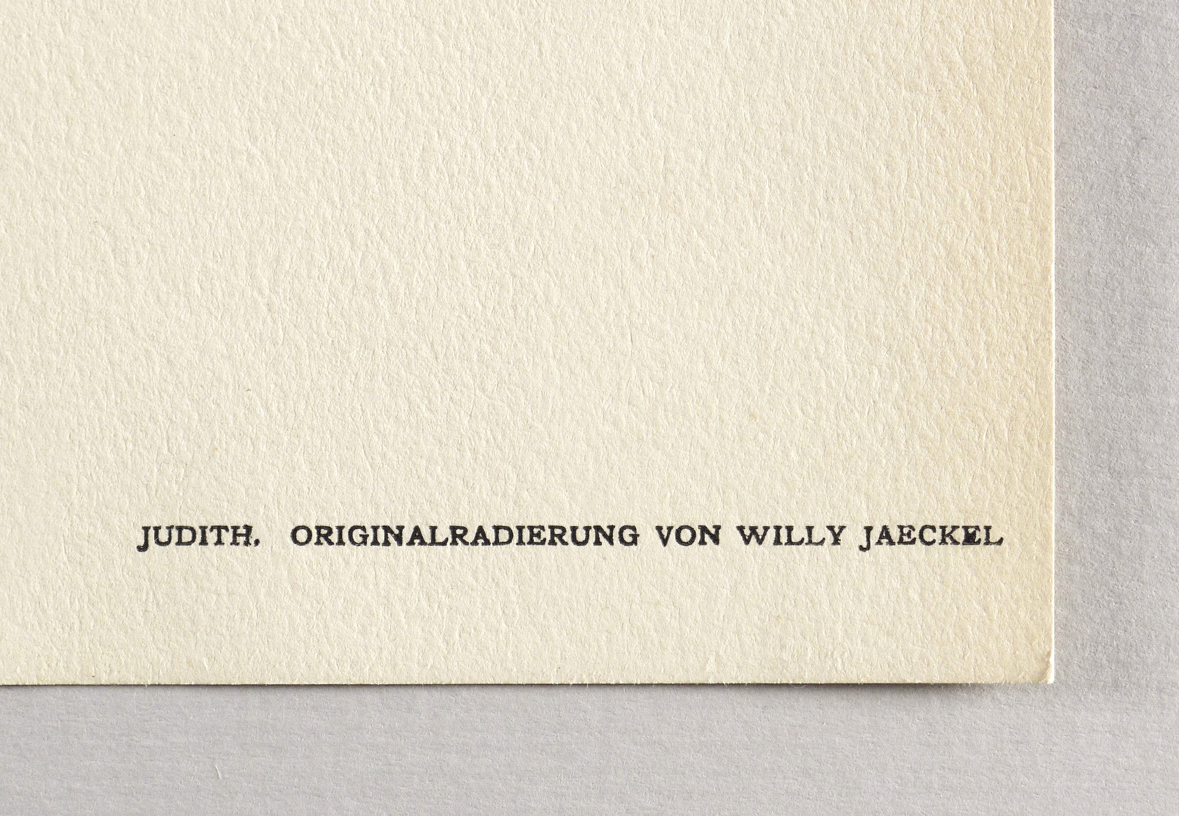 Stilijanov-Nedo 13. – Aus: Zeitschrift für bildende Kunst (Leipzig: E.A. Seemann 1915), Bd. 26. – Nicht handsigniert. Im unteren Rand typografisch bezeichnet: ″JUDITH. ORIGINALRADIERUNG VON WILLY JAECKEL″. – Etwas fleckig im breiten Rand. Mangelhafte bis mäßig gut erhalten.