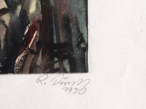1950. Aquarell, auf Karton. – Originale Künstlergrafik, von Richard Pusch. – Unikat. – 31,2 x 19,2 cm (Darstellung / Blatt), 47 x 34 cm (Trägerkarton).