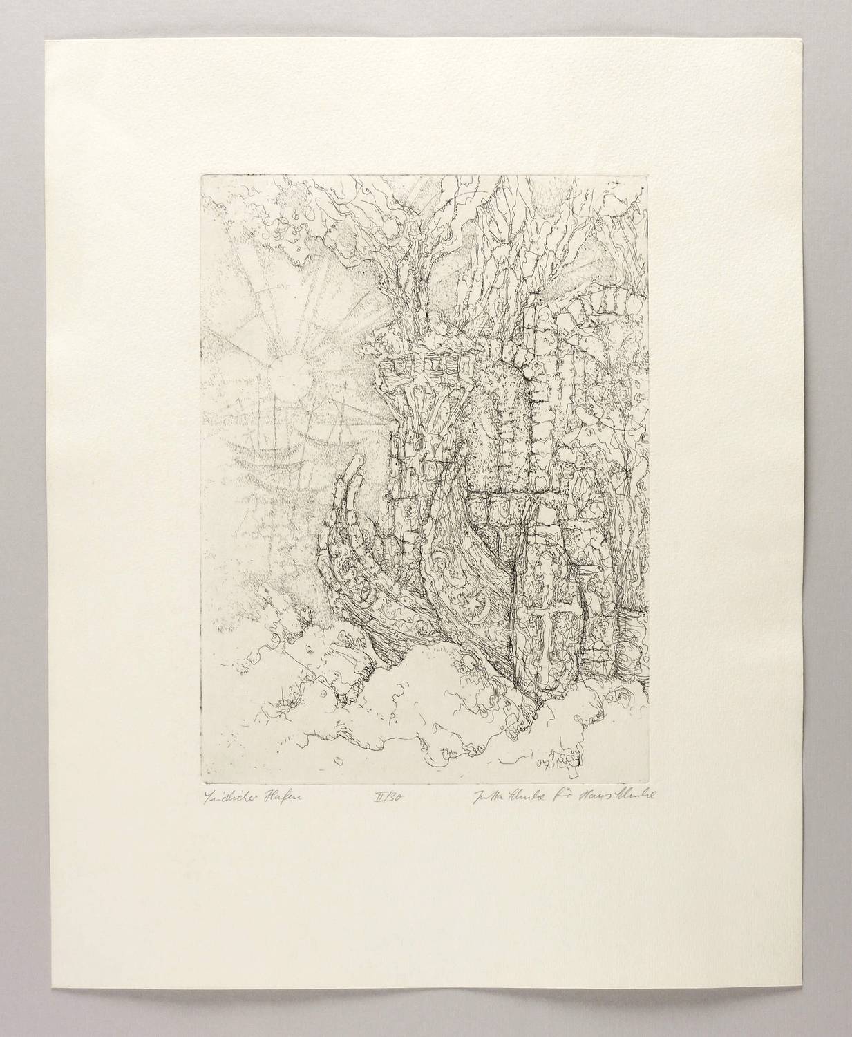 1967. Radierung / Strichätzung, in Schwarz, auf gehämmertem hellgelbem Maschinenpapier. – Originale Künstlergrafik, von Hans Schulze. – AUflage Exemplar. Nr. 2/30. – 31,3 x 23,0 cm (Darstellung / Platte), 49 x 39 cm (Blatt).