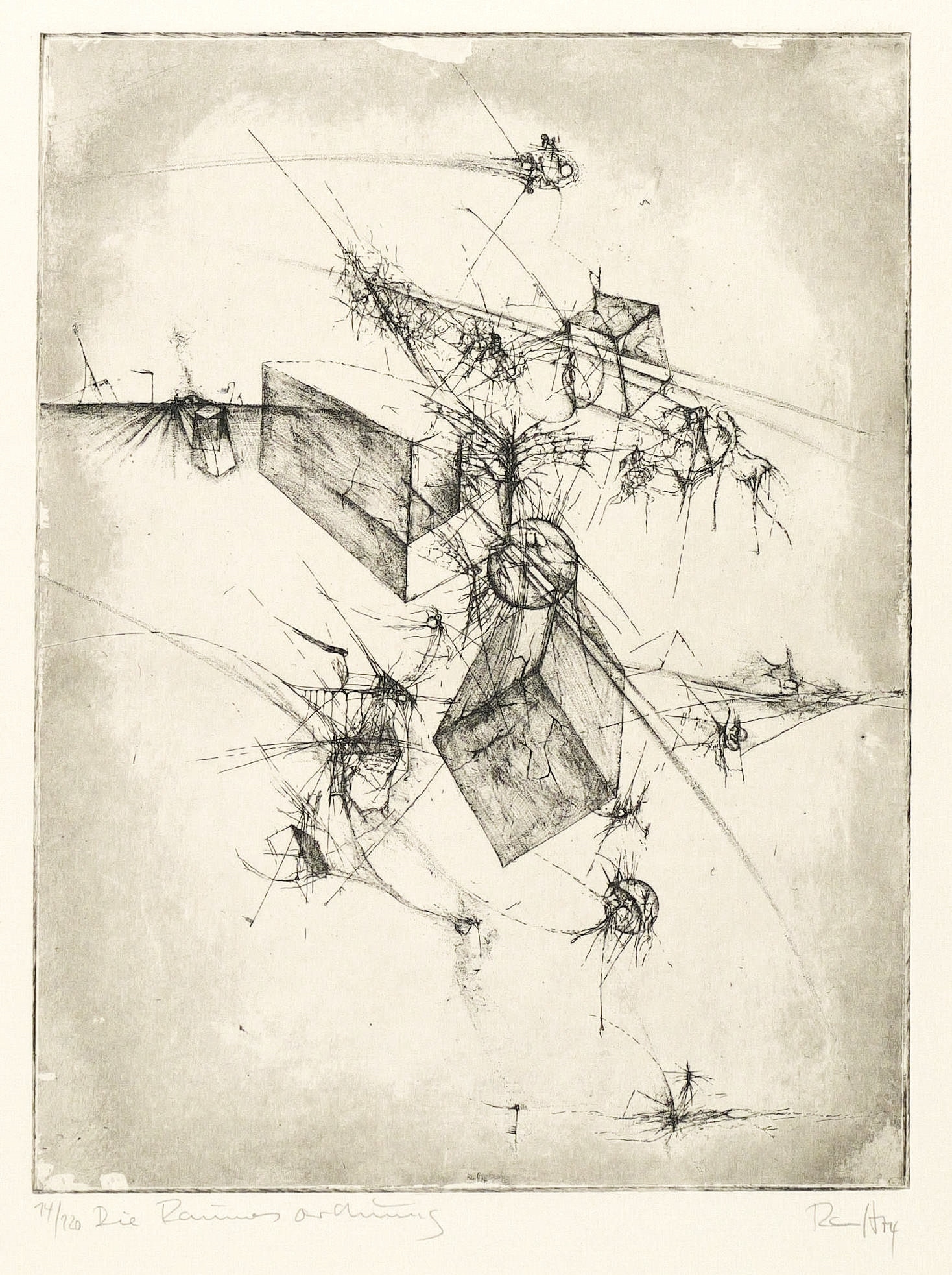 1974. Radierung / Strichätzung, in Schwarz, mit Plattenton, auf Weißenborn-Bütten. – Originale Künstlergrafik, von Thomas Ranft. – Auflage Exemplar Nr. 14/120. – 25,2 x 19,1 cm (Darstellung / Platte), 50 x 40 cm (Blatt).