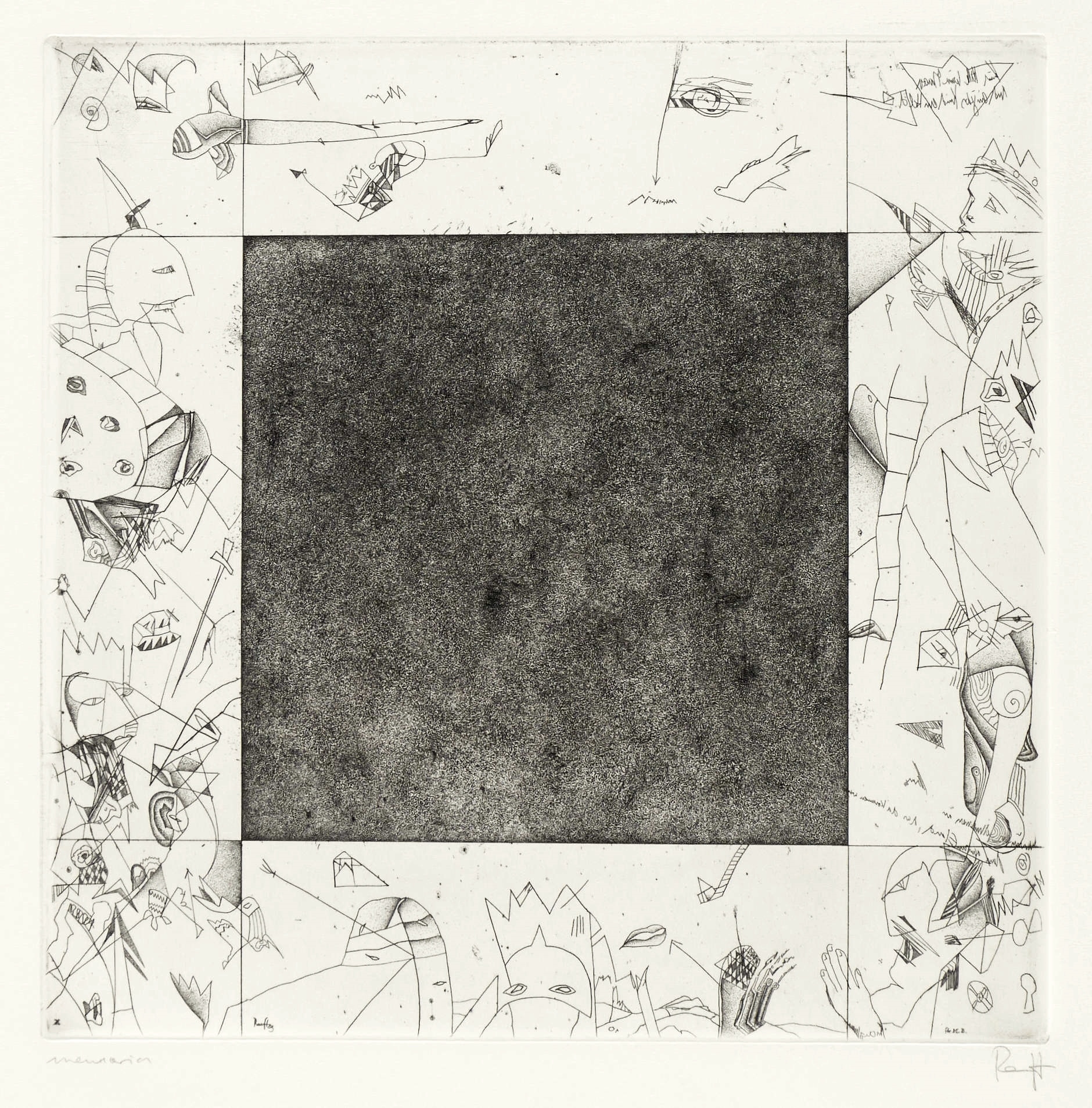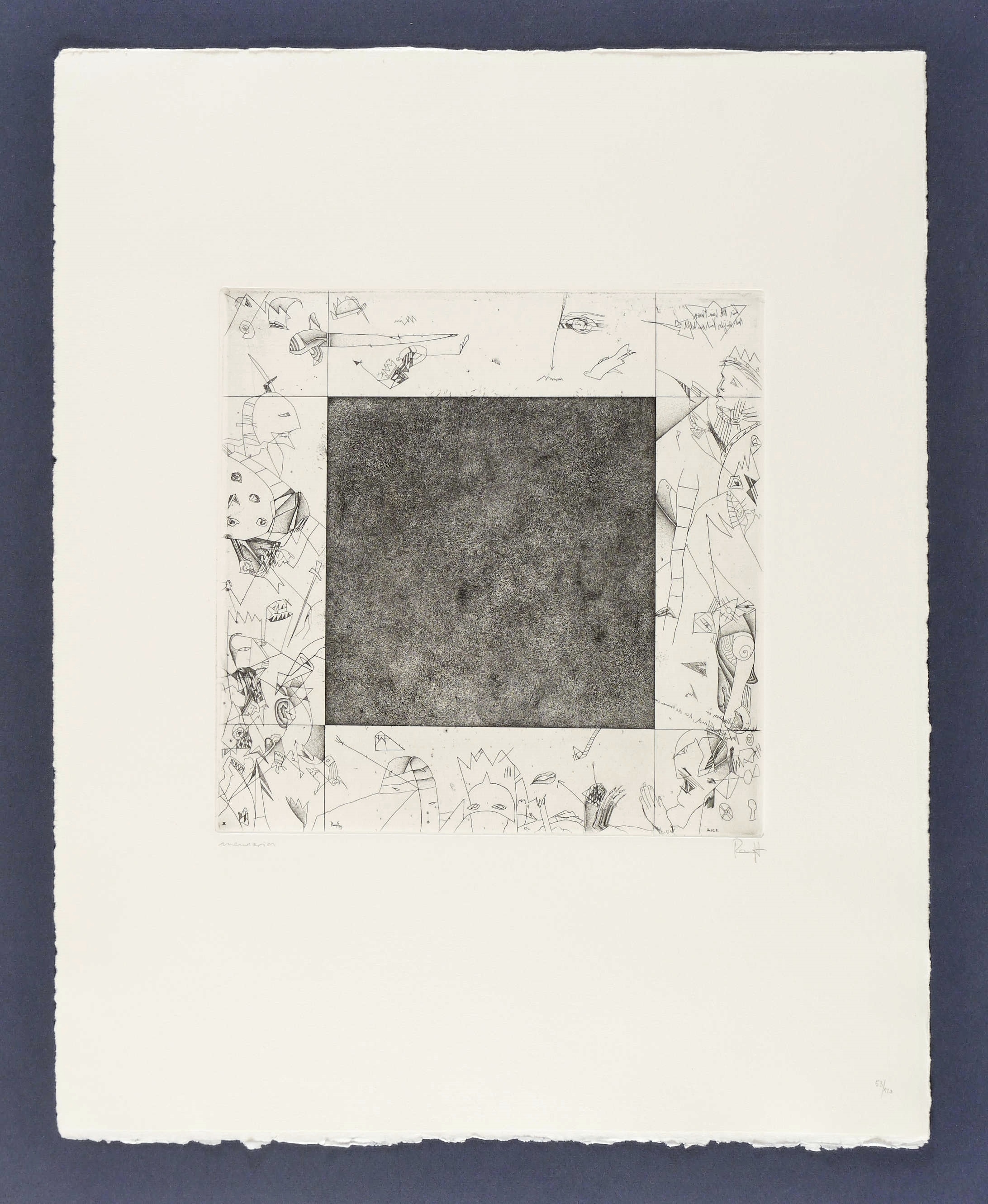 1983. Radierung / Strichätzung & Punzenstich, in Schwarz, auf Hahnemühle. – Originale Künstlergrafik, von Thomas Ranft. – Auflage Exemplar Nr. 53/120. – 24,7 x 24,7 cm (Darstellung / Platte), 50 x 40 cm (Blatt).