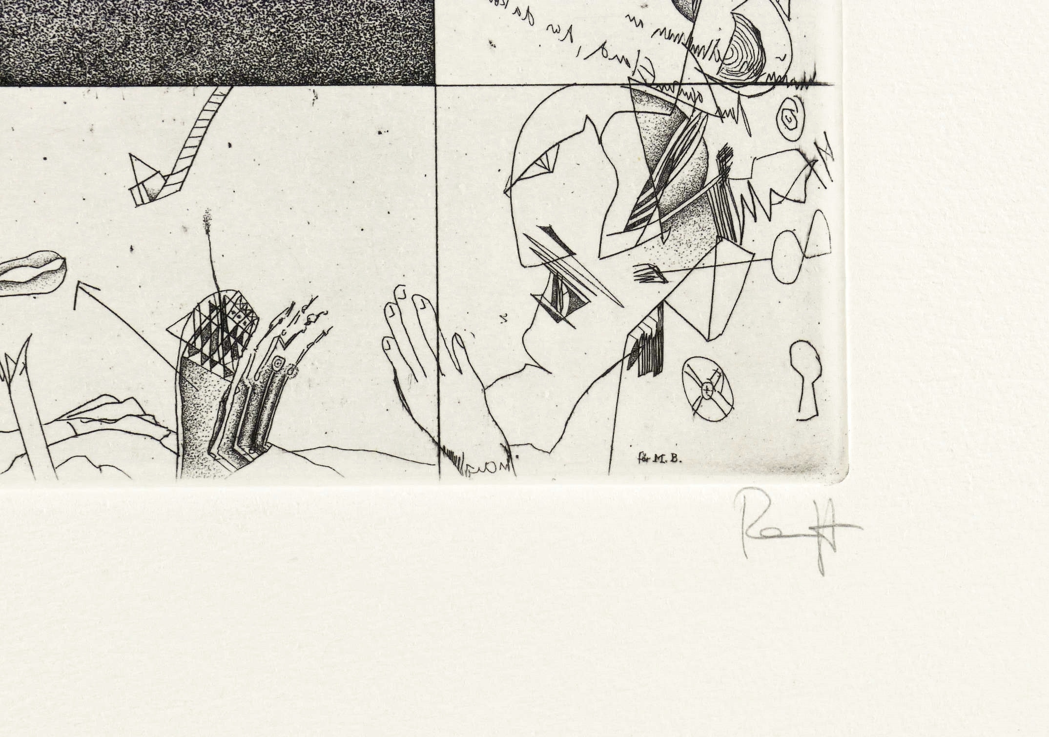 Rechts unten in Bleistift signiert. Links Titel. In der rechten unteren Blattecke Auflagenbezeichnung. In der Platte diverse, teils spiegelschriftliche Inschriften; am unteren Rand links Signatur und Jahr, rechts die Bezeichnung: ″für M.B.″ – Tadelloser Zustand.