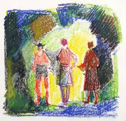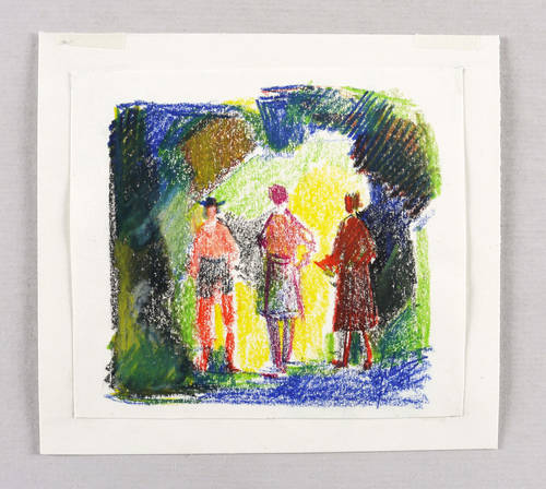Verso auf dem Trägerkarton in Bleistift bezeichnet: ″Wilhelm Engelmann 'Ausflug' Farbkreide 1965″. – Original vom Künstler auf Trägerkarton gesetzt. Sehr guter Zustand.