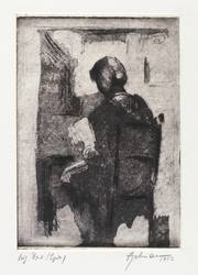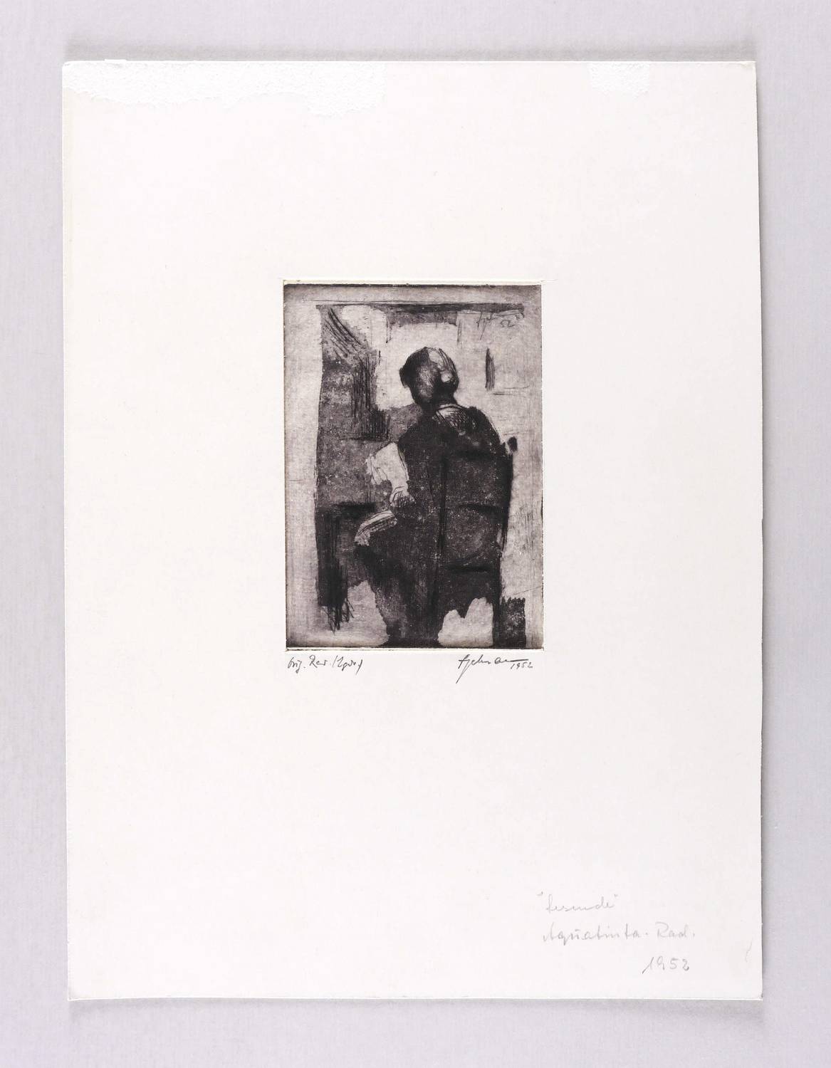Auf dem Passepartout rechts unten in Bleistift signiert und datiert: ″Engelmann 1952″. Links bezeichnet: ″Orig. Rad. (Egdr.)″. Im unteren Rand rechts in Bleistift bezeichnet: ″Lesende / Aquatinta-Rad. / 1952″. Auf der Rückseite zusätzlich signiert und bezeichnet. – Sehr guter Zustand.