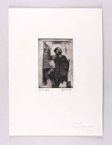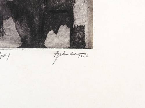 1952. Radierung / Aquatinta, in Schwarz, auf hellchamois Velinkarton. – Originale Künstlergrafik, von Wilhelm Engelmann. – 12,9 x 9,3 cm (Darstellung / Platte), 25 x 18 cm (Blatt), 34 x 25 cm (Passepartout).
