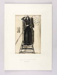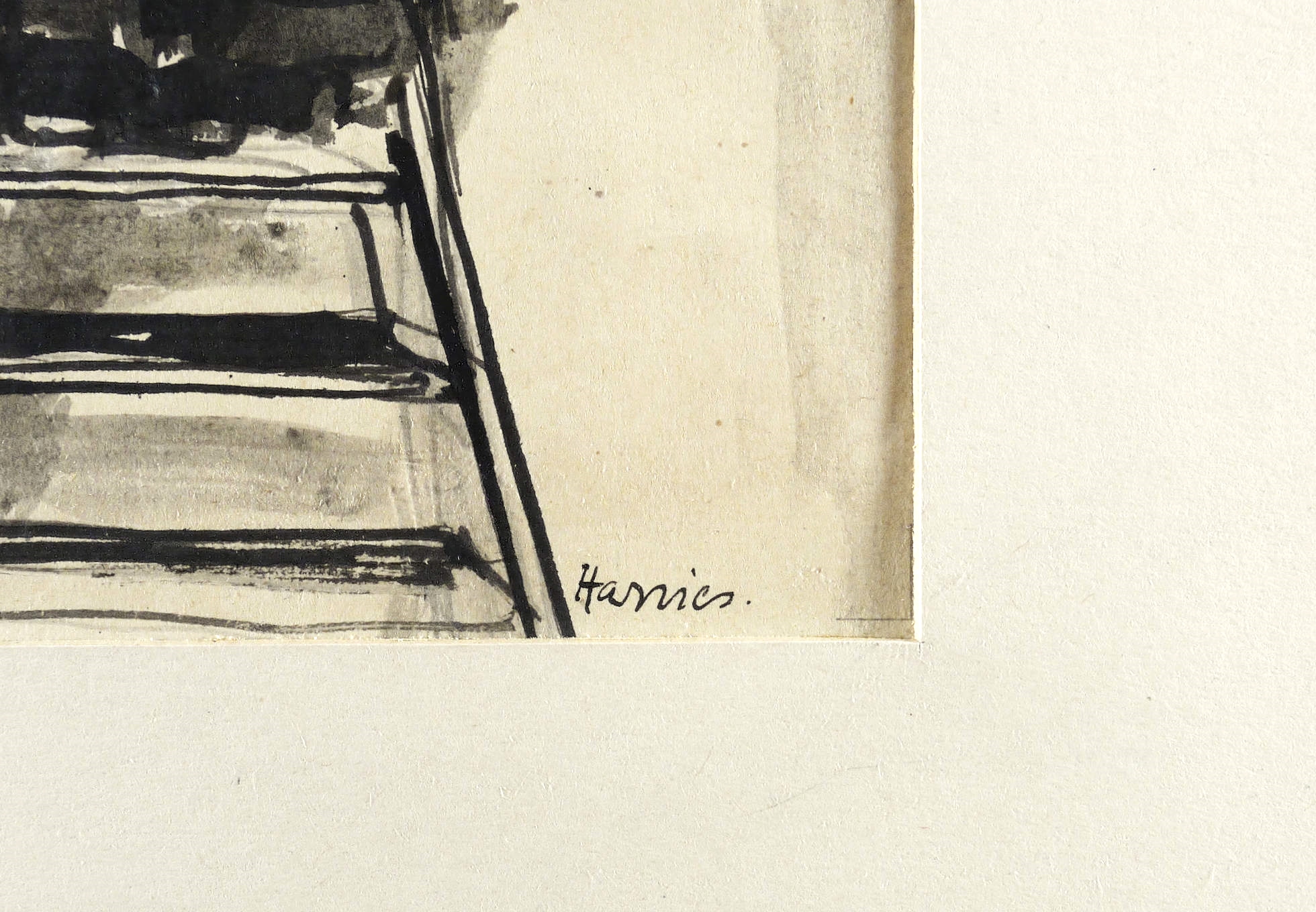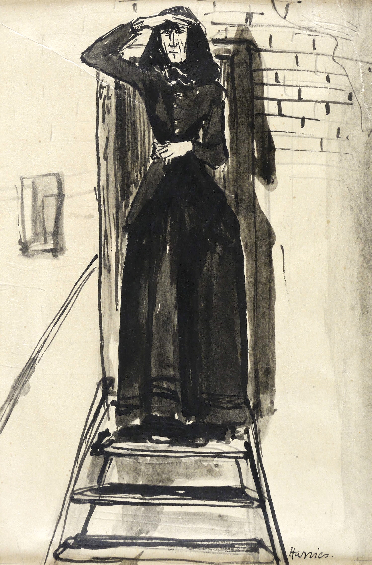 1940-1950. Zeichnung / Feder, in schwarzer & grauer Tusche, auf leichtem gelbem Velin. – Originale Künstlergrafik, von Katrine Harries. – Unikat. – 21,0 x 14,4 cm (Darstellung / Blatt), 33 x 24 cm (Passepartout).