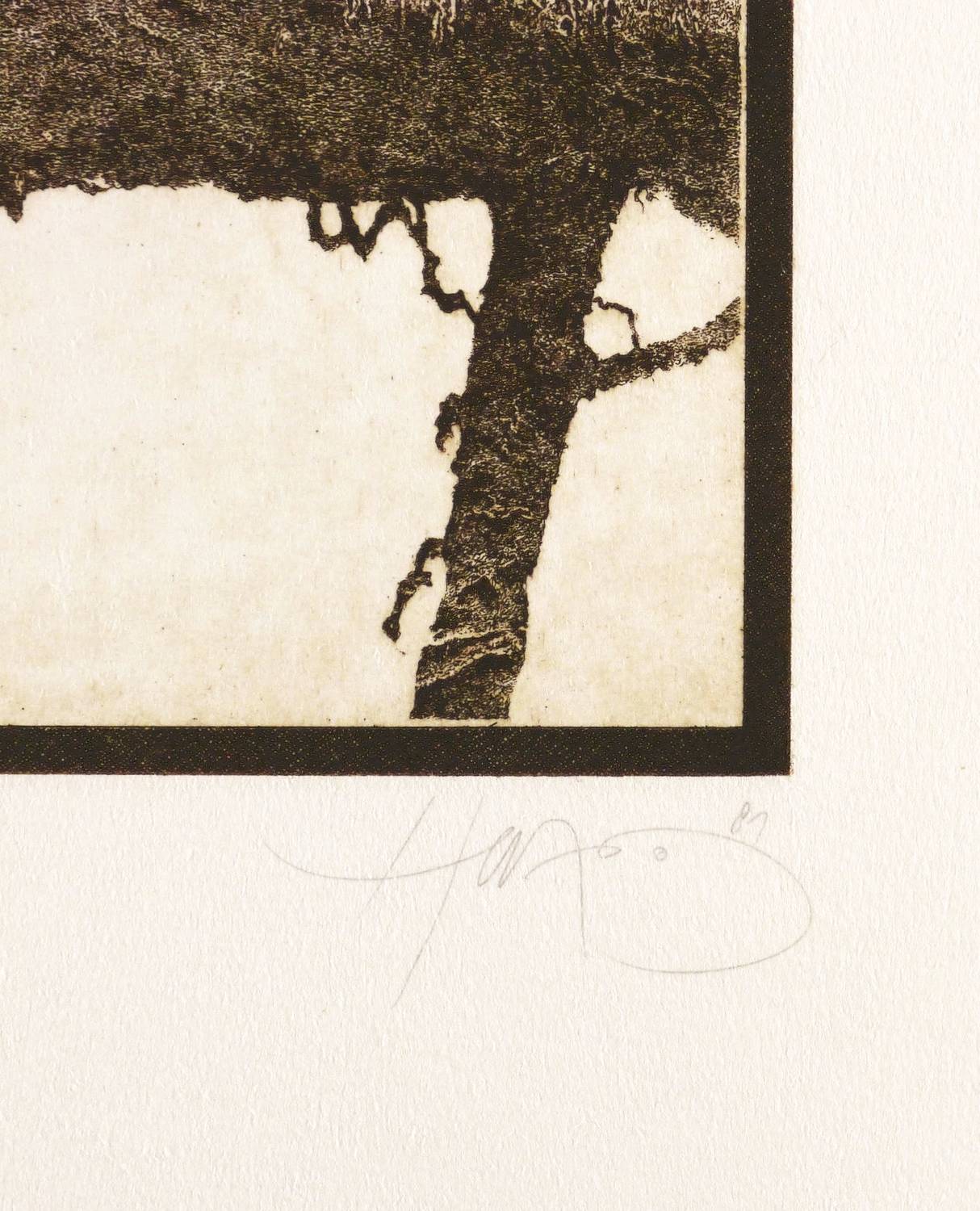 1981. Radierung / Strichätzung, mit Plattenton, in Bister, auf weichem chamois Velin. – Originale Künstlergrafik, von Walter Herzog. – Auflage Exemplar Nr. 18/75. – 26,7 x 26,7 cm (Darstellung / Platte), 40 x 54 cm (Blatt).