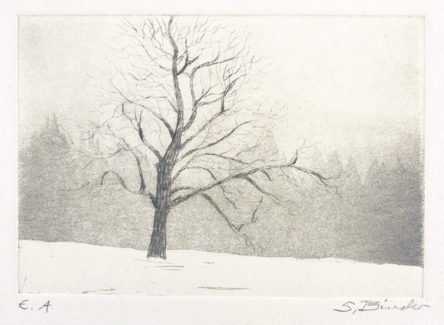 1970-1980. Radierung / Strichätzung & Aquatinta, in Schwarz, auf hellchamois Velinkarton. – Originale Künstlergrafik, von Sepp Binder. – Künstlerexemplar (e.a.). – 9,5 x 13,6 cm (Darstellung / Platte), 16 x 18 cm (Blatt).