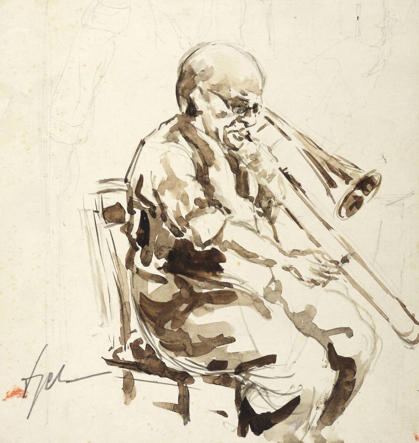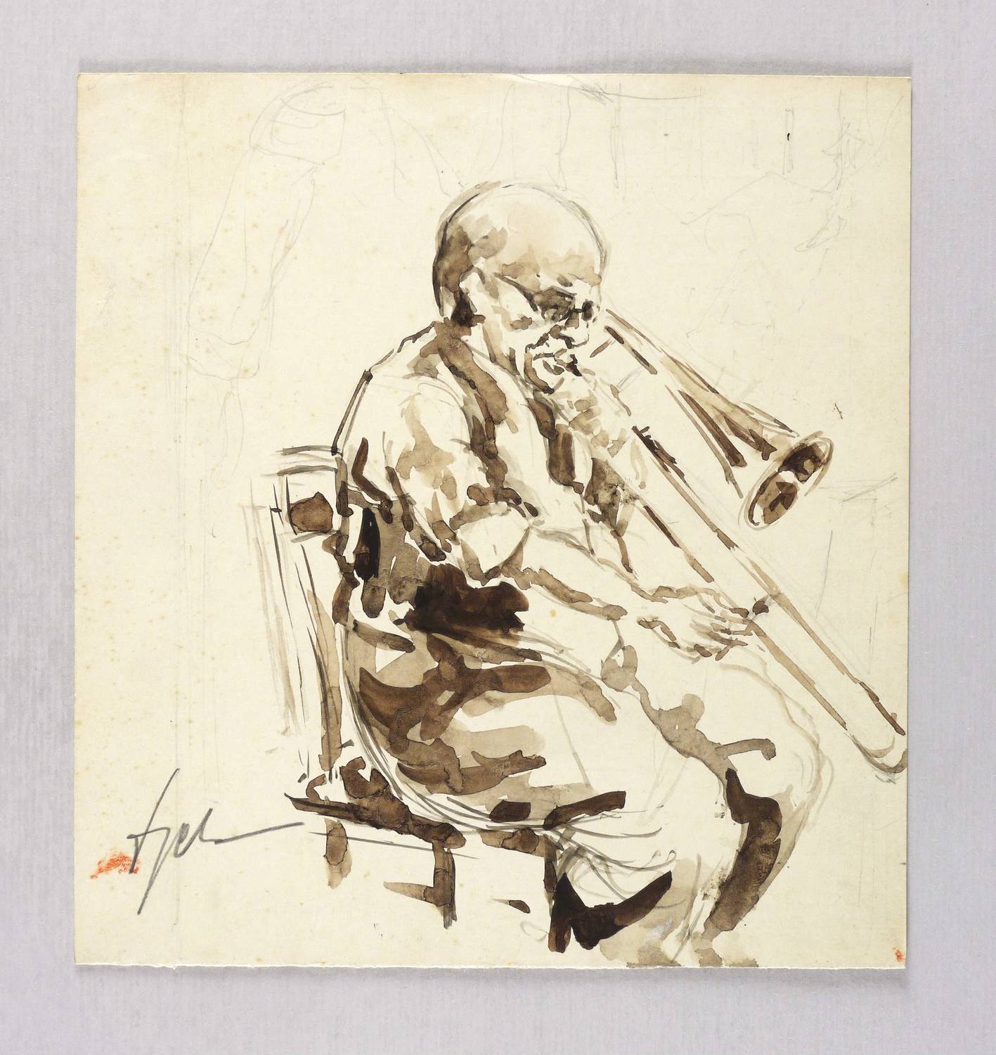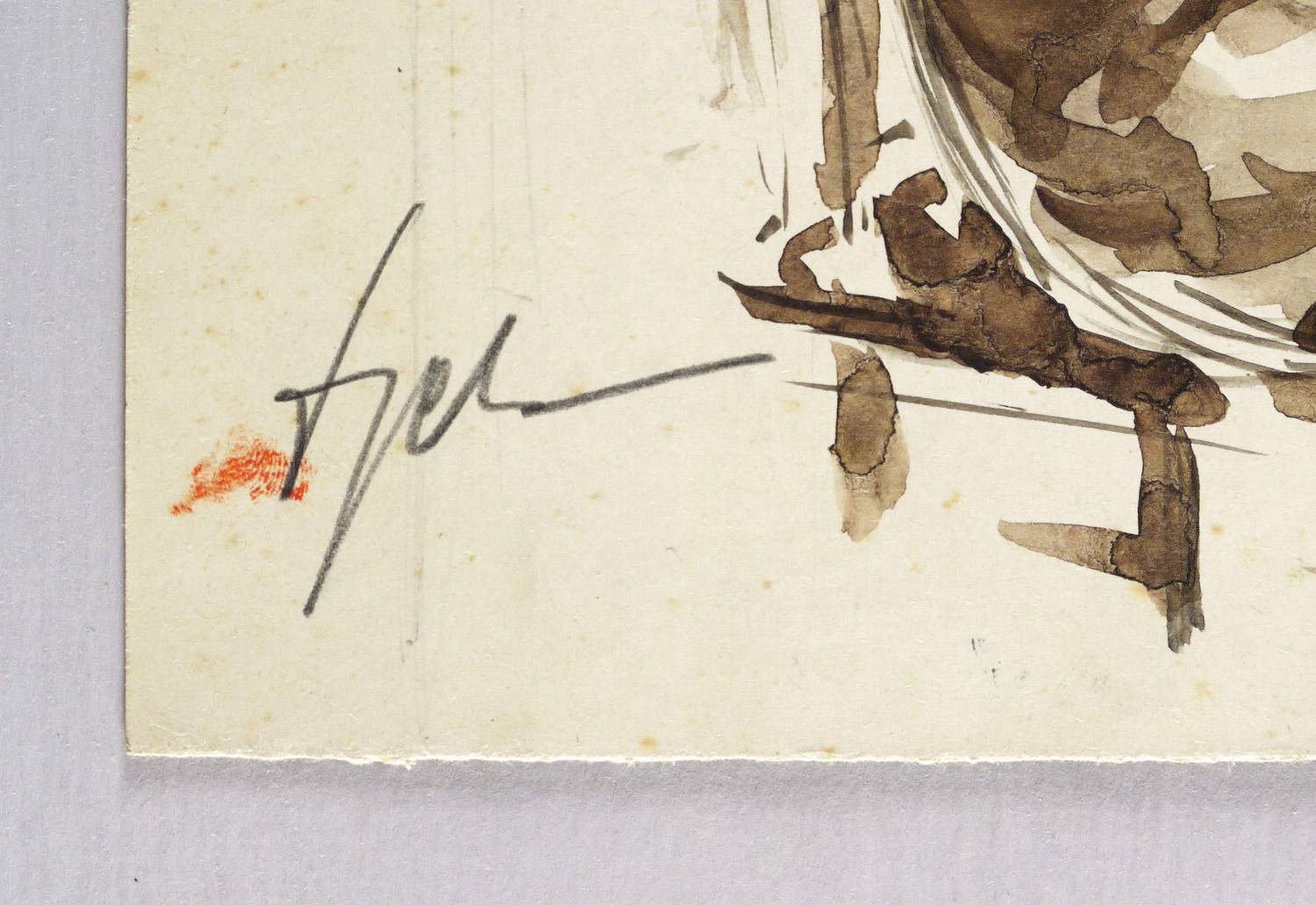 1950-1960. Zeichnung / Pinselzeichnung, in brauner Tusche, über Bleistift, auf gelblichem Papier. – Originale Künstlergrafik, von Wilhelm Engelmann. – Unikat. – 21,7 x 20,1 cm (Darstellung / Blatt).