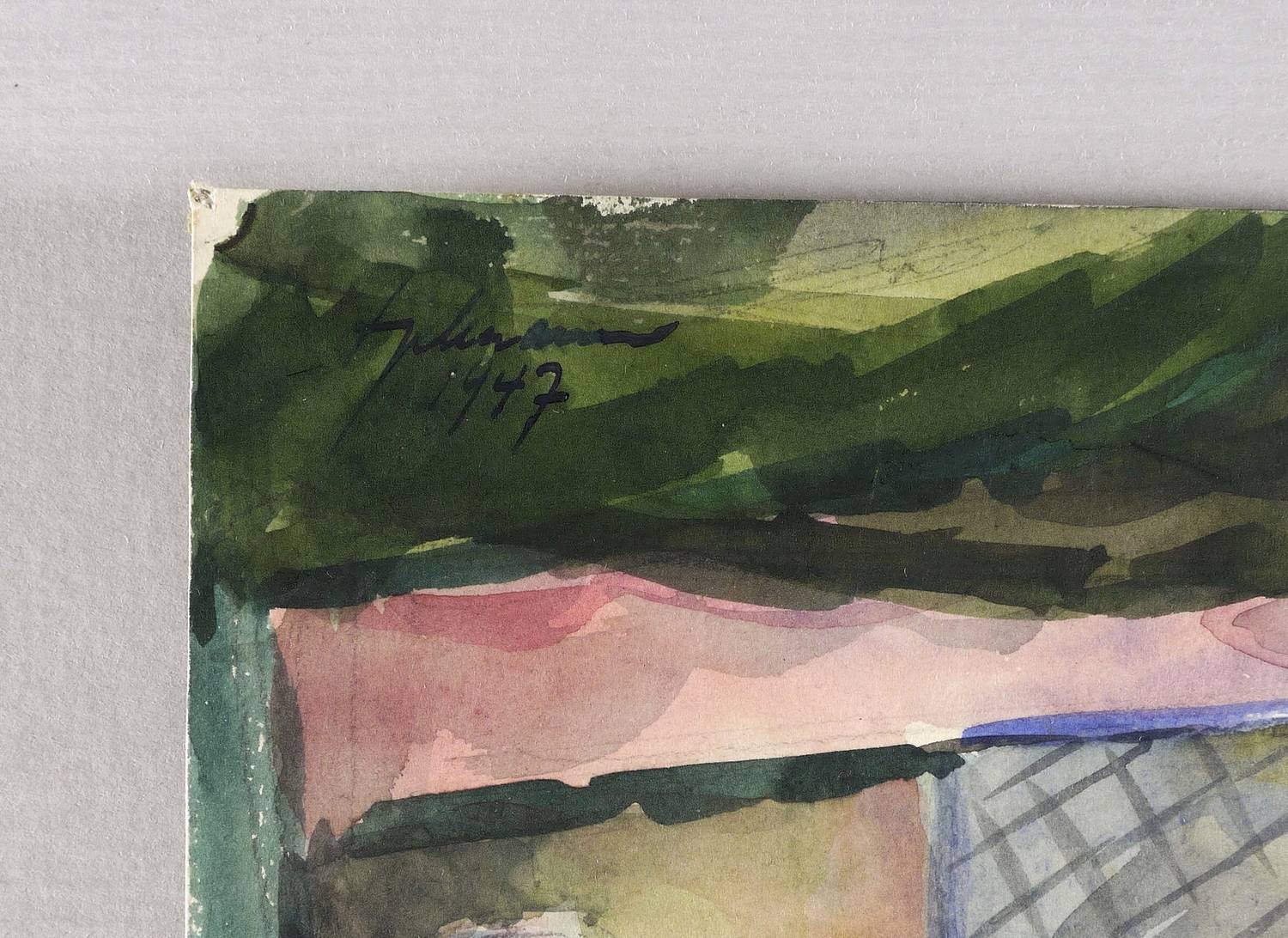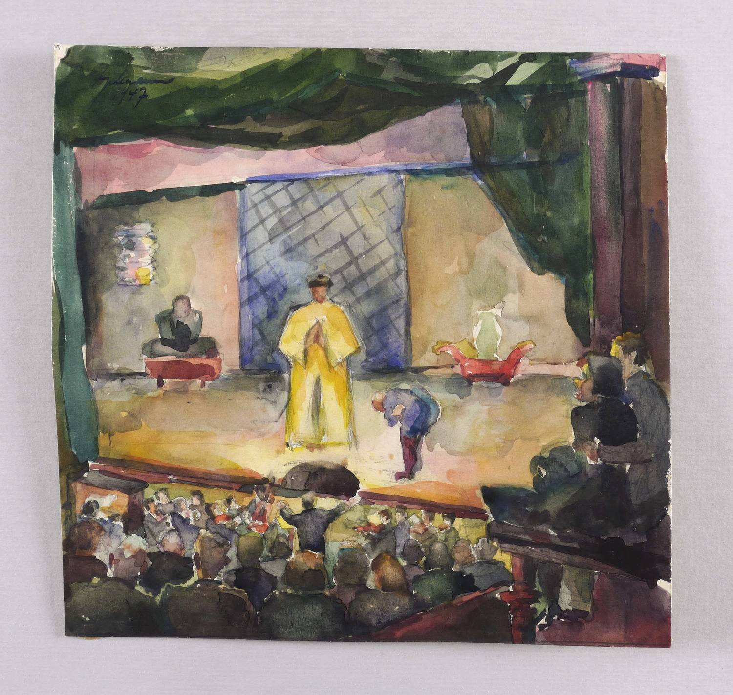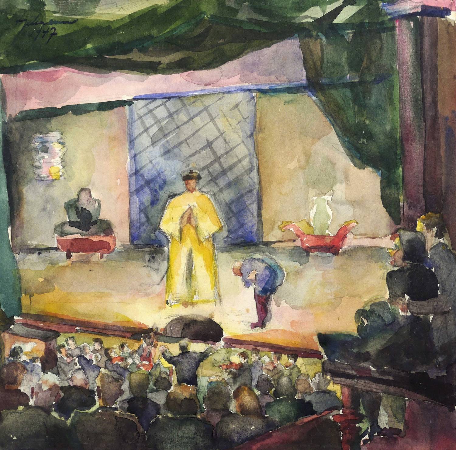 Links oben in schwarzer Tusche signiert und datiert: ″Engelmann 1947″. Verso in Bleistift eigenhöändig bezeichnet: ″Vorstadttheater / Aquarell // Wilhelm Engelmnn / Vienenburg / Steinweg 5″. Dazu Stempel: ″Bund bildender Künstler (...)″. – Guter Zustand.