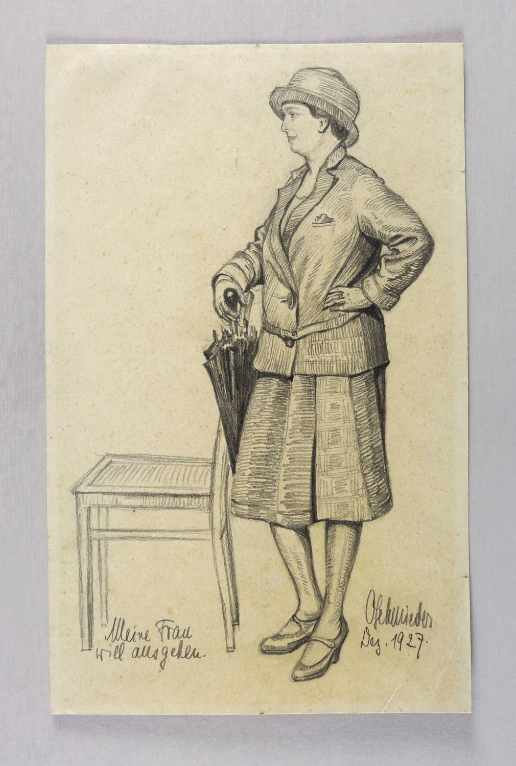Rechts unten in Bleistift signiert und datiert: ″OSchmieder Dez. 1927.″ Links bezeichnet: ″Meine Frau will ausgehen.″ – Sehr guter Zustand.