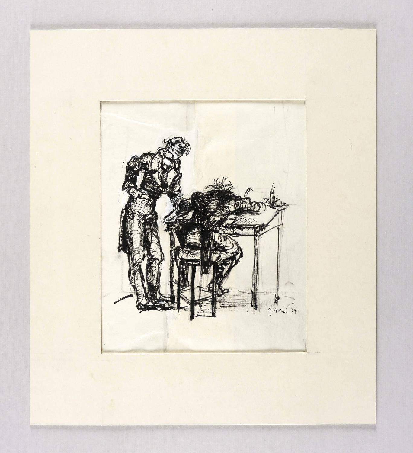 Rechts unten in schwarzer Feder signiert: ″Harries 34″. – Auf zwei miteinander verleimten Papierstücken. Original hinter Passepartout montiert. Geringfügig knickspurig. Mäßig gut erhalten.