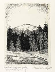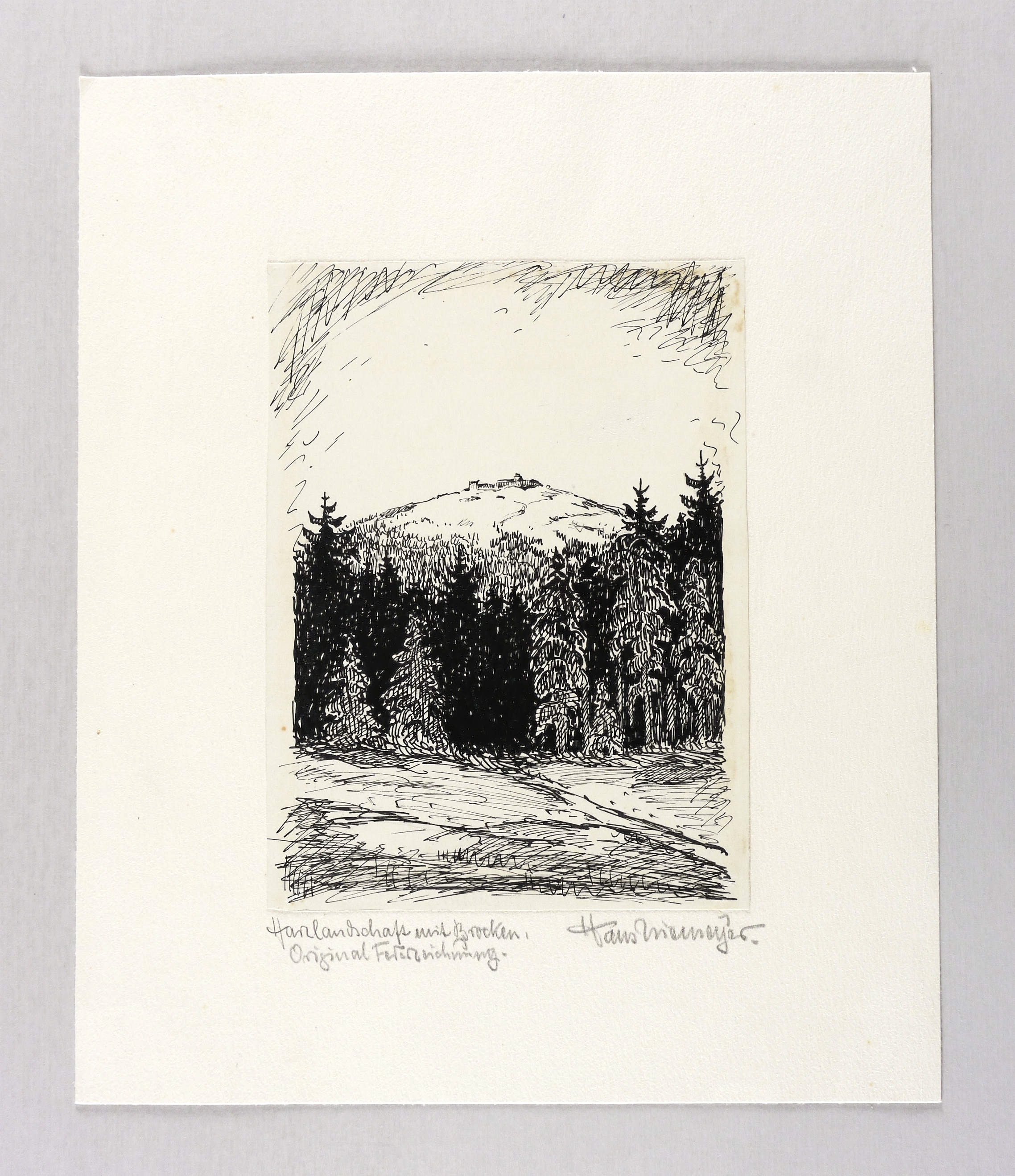 Auf dem Untersatzkarton rechts unten in Bleistift signert: ″Hans Niemeyer″. Links bezeichnet: ″Harzlandschaft mit Brocken. Original Federzeichnung.″ – Original auf Trägerkarton gesetzt. Blattecke rechts oben mit unscheinbarer bräunlicher Verfärbung. Sonst ohne Mängel. Guter Zustand.