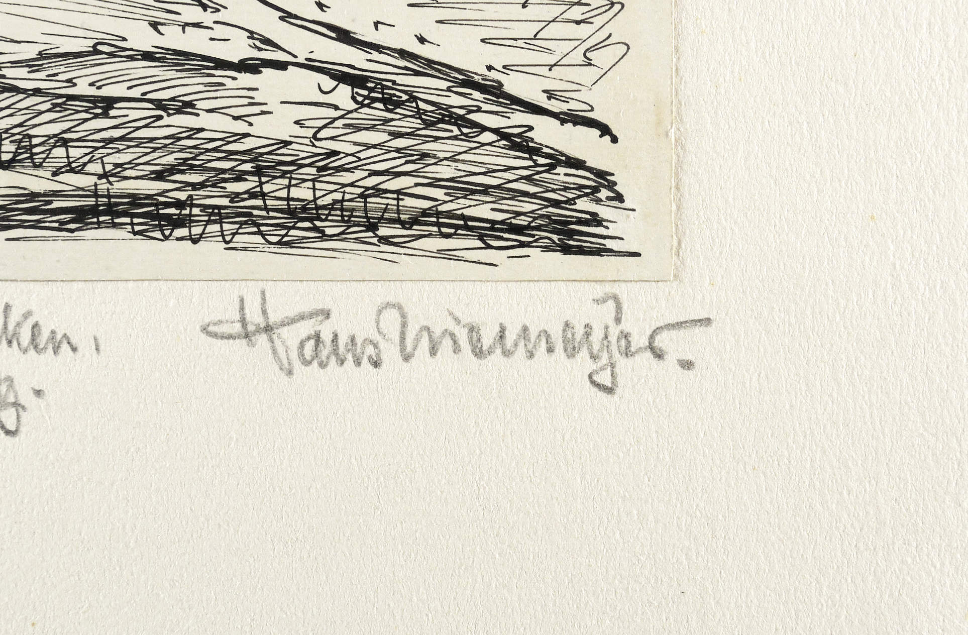 Um 1930. Zeichnung / Feder, in schwarzer Tusche, auf glattem hellem Velin. – Originale Künstlergrafik, von Hans Niemeyer. – Unikat. – 34 x 29 cm (Trägerkarton), 21,5 x 16,0 cm (Darstellung / Blatt).