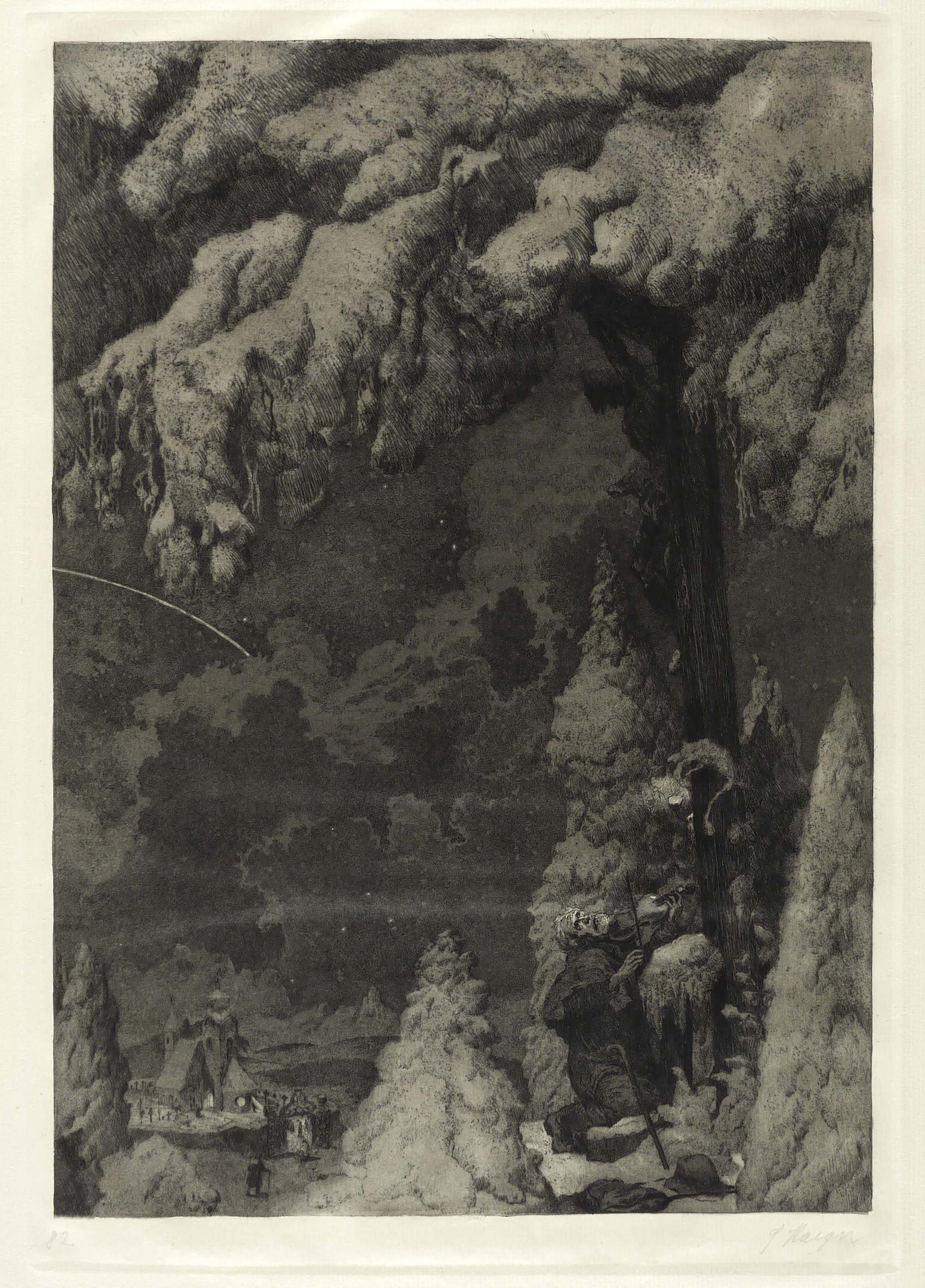 Muschler 119 IV (von IV). – Rechts unten in Bleistift signiert: ″FStaeger″. Links Auflagenbezeichnung. Wasserzeichen. – Unter schneebedeckten Tannen und einem in die Nacht ragenden Kreuz ein Geige spielender alter Mann. Im Hintergrund eine ländliche Kirche zur Christmette. – Originalrandiges Exemplar mit Schöpfrändern. Papier im Bereich der Platte etwas gewellt. Guter Zustand.