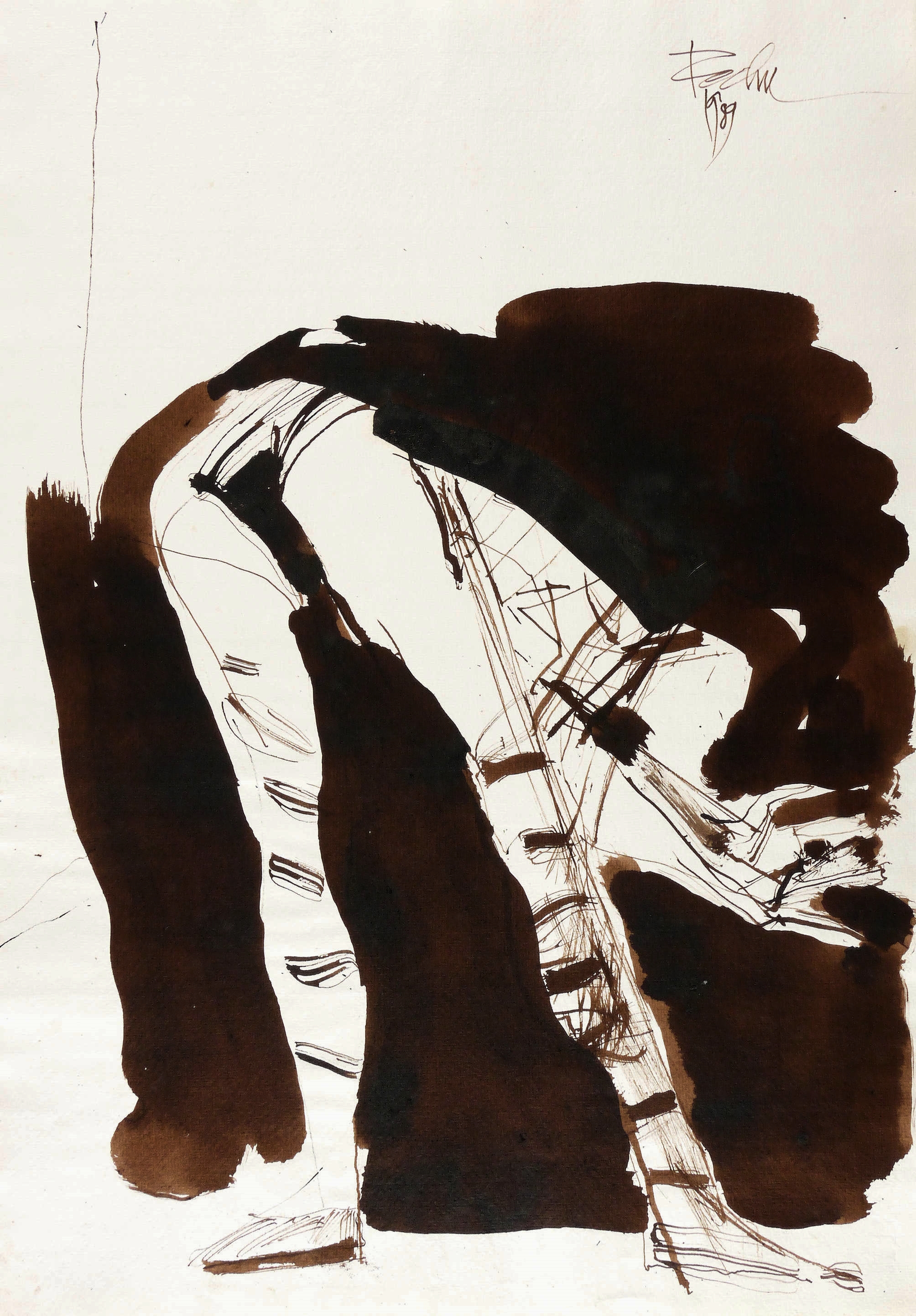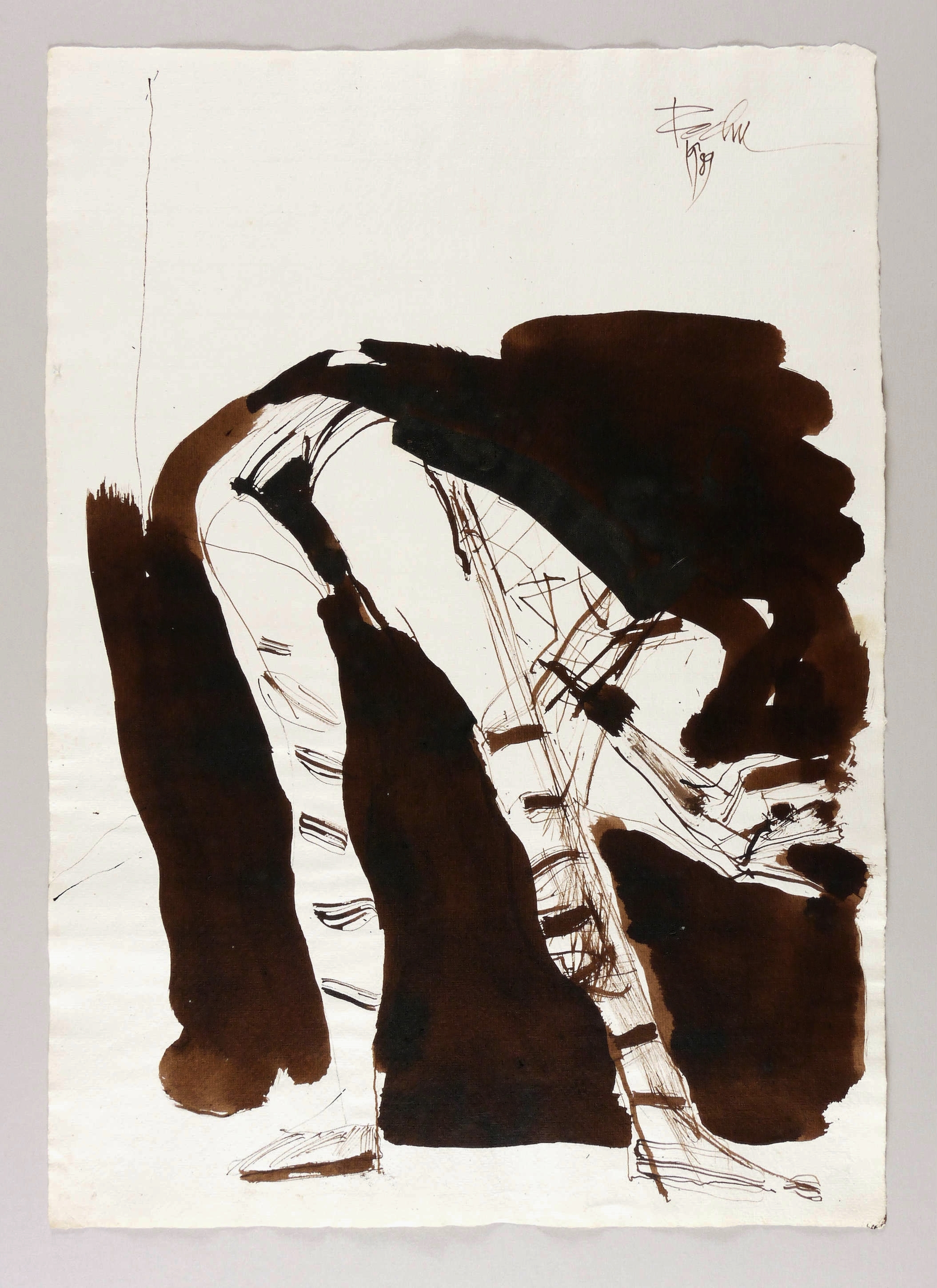 1989. Zeichnung / Feder- & Pinselzeichnung, in brauner Tusche, auf rauem hellchamois Losin-Bütten. – Von Günther Rechn. – 42,0 x 59,0 cm (Darstellung / Blatt).
