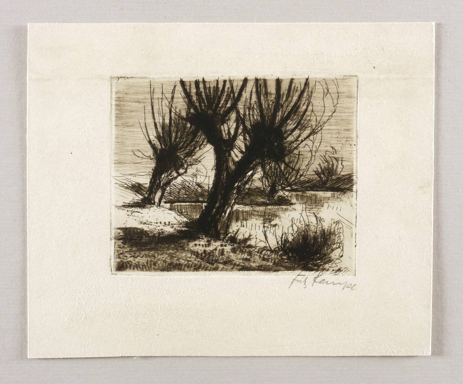 Um 1920. Radierung / Strichätzung & Kaltnadel, in Schwarz, auf gelbem Kupferdruckkarton. – Originale Künstlergrafik, von Fritz Kempe. – 9,0 x 11,1 cm (Darstellung / Platte), 15 x 18 cm (Blatt).