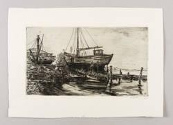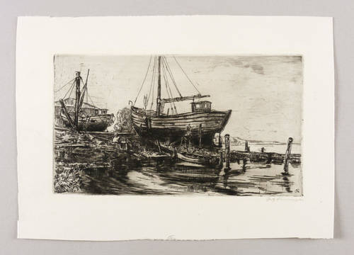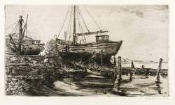 1930-1935. Radierung / Strichätzung & Kaltnadel, in Schwarz, auf kräftigem gelbem Velin. – Originale Künstlergrafik, von Fritz Kempe. – 15,4 x 27,0 cm (Darstellung / Platte), 25 x 35 cm (Blatt).