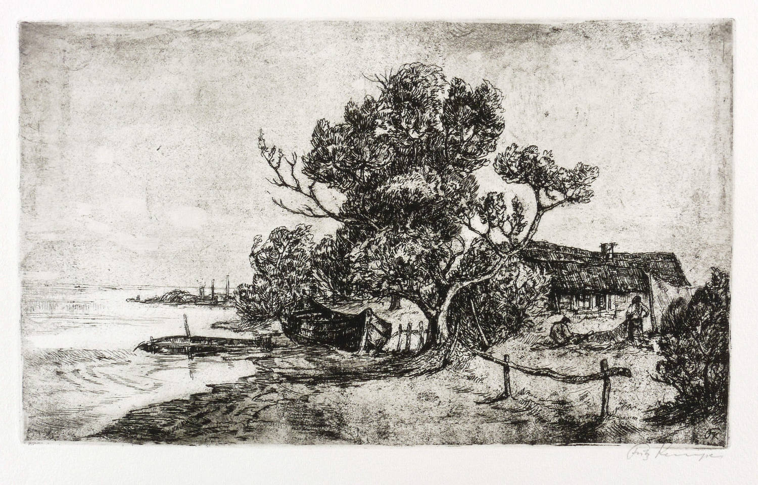 1930-1940. Radierung / Vernis mou & Strichätzung, in Schwarz, auf weichem hellgelbem Velin. – Originale Künstlergrafik, von Fritz Kempe. – 19,8 x 32,9 cm (Darstellung / Platte), 27 x 38 cm (Blatt).