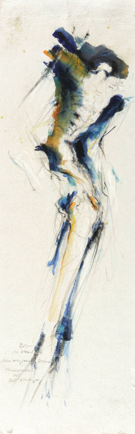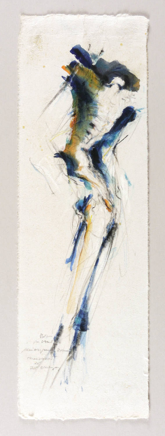 1987. Mischtechnik / Aquarell, Tusche & Kreide, auf rauem hellchamois Japanbütten. – Originale Künstlergrafik, von Manfred Kache. – Unikat. – 38,7 x 12,4 cm (Darstellung / Blatt).
