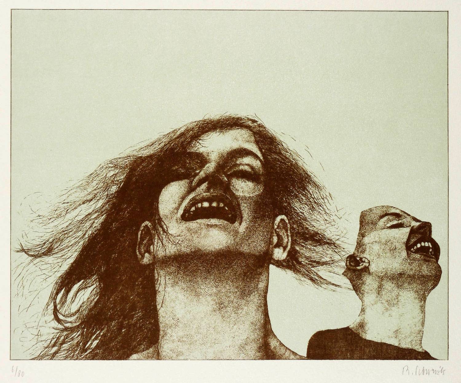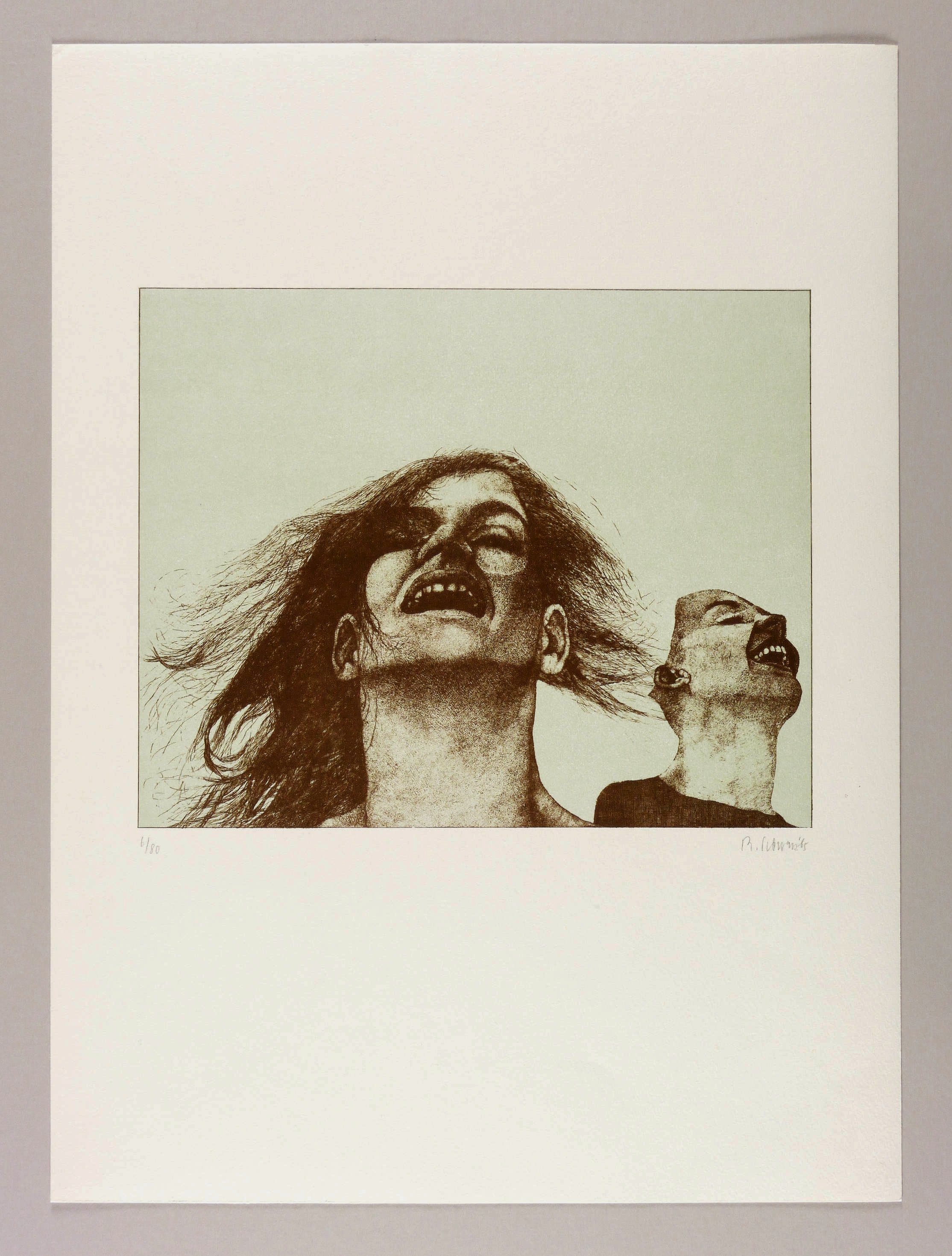 Aus: Reiner Schwarz, Phantastische Physiognomien. Sieben Lithographien (Hildesheim: Verlag Schrift und Bild 1965). – In Bleistift rechts unten signiert und datiert: ″R. Schwarz '65″. Links Auflagenbezeichnung. – Tadellos erhalten. Sehr guter Zustand.
