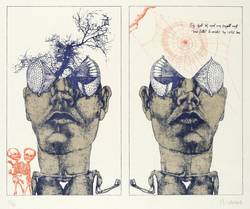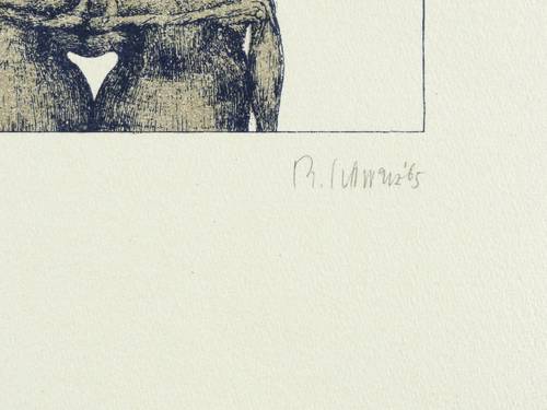 Aus: Reiner Schwarz, Phantastische Physiognomien. Sieben Lithographien (Hildesheim: Verlag Schrift und Bild 1965). – In Bleistift rechts unten signiert und datiert: ″R. Schwarz '65″. Links Auflagenbezeichnung. – Tadellos erhalten. Sehr guter Zustand.