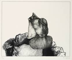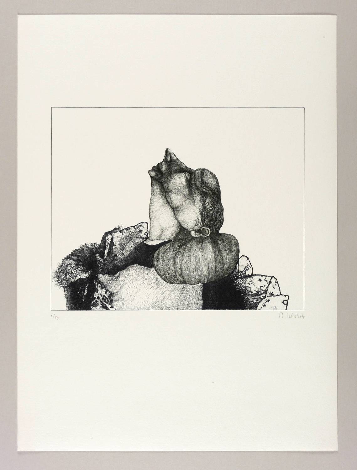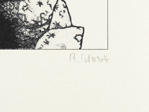 Aus: Reiner Schwarz, Phantastische Physiognomien. Sieben Lithographien (Hildesheim: Verlag Schrift und Bild 1965). – In Bleistift rechts unten signiert und datiert: ″R. Schwarz '65″. Links Auflagenbezeichnung. – Links unten leichte Stauchung der Blattecke. Sonst ohne Tadel. Noch guter Zustand.