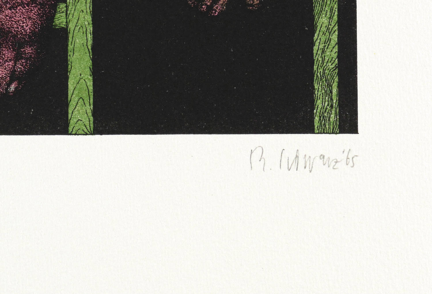 1965. Farblithografie / Feder- & Pinsellithografie, in 4 Farben, auf hartem hellchamois Velin. – Originale Künstlergrafik, von Reiner Schwarz. – Auflage Exemplar Nr. 6/80. – 24,2 x 30,0 cm (Darstellung / Druckbild), 52 x 38 cm (Blatt).