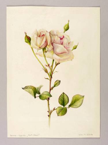 Rechts unten in Bleistift signiert: ″Elsa M. Felsko″. Links bezeichnet: ″Teerose - Hybride 'Gretl Greul'″. Verso weiter bezeichnet: ″Tee-Hybride Botanischer Garten Berlin / Gretl Greul″. – Botanisches Aquarell von allerhöchster zeichnerischer wie koloristischer Qualität. Besonders schönes Blatt der Künstlerin. – Papier altersbedingt mit minimalen Lagerspuren, eine winzige Druckstelle im Papier rechts unten im Rand. INsgesamt nahezu tadelos. Guter bis sehr guiter Zustand.