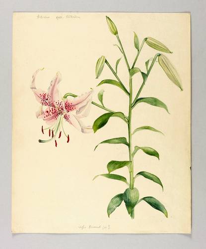 Rechts oben in Bleistift bezeichnet: ″Lilium spec. Rubrum″. Am unteren Blattrand Notiz: ″woher kommt sie?″. Verso signiert: ″Elsa M. Felsko″. – Botanisches Aquarell von allerhöchster zeichnerischer wie koloristischer Qualität. – Winzige Fehlstelle im rechten Blattrand außerhalb der Darstellung. Sonst tadellos. Guter bis sehr guter Zustand.