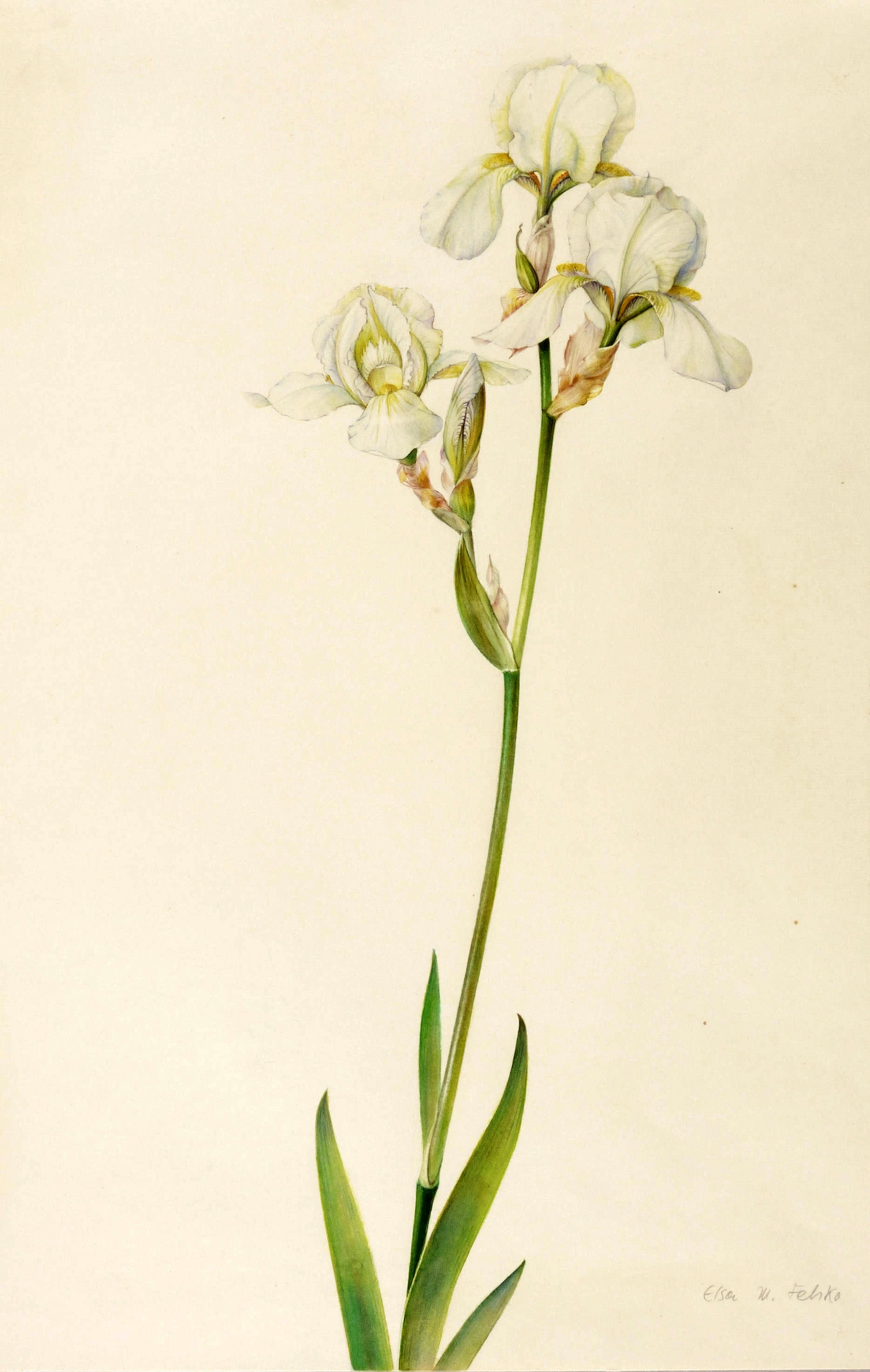 Rechts unten in Bleistift signiert: ″Elsa M. Felsko″. Verso bezeichnet: ″Bart-Iris 'Peewee' / (Alte diploide niedrige (halbhohe) Bart-Iris″.″. – Botanisches Aquarell von allerhöchster zeichnerischer wie koloristischer Qualität. – Unscheinbare Lagerspuren. Farbfrisch. Sehr guter Erhaltungszustand.