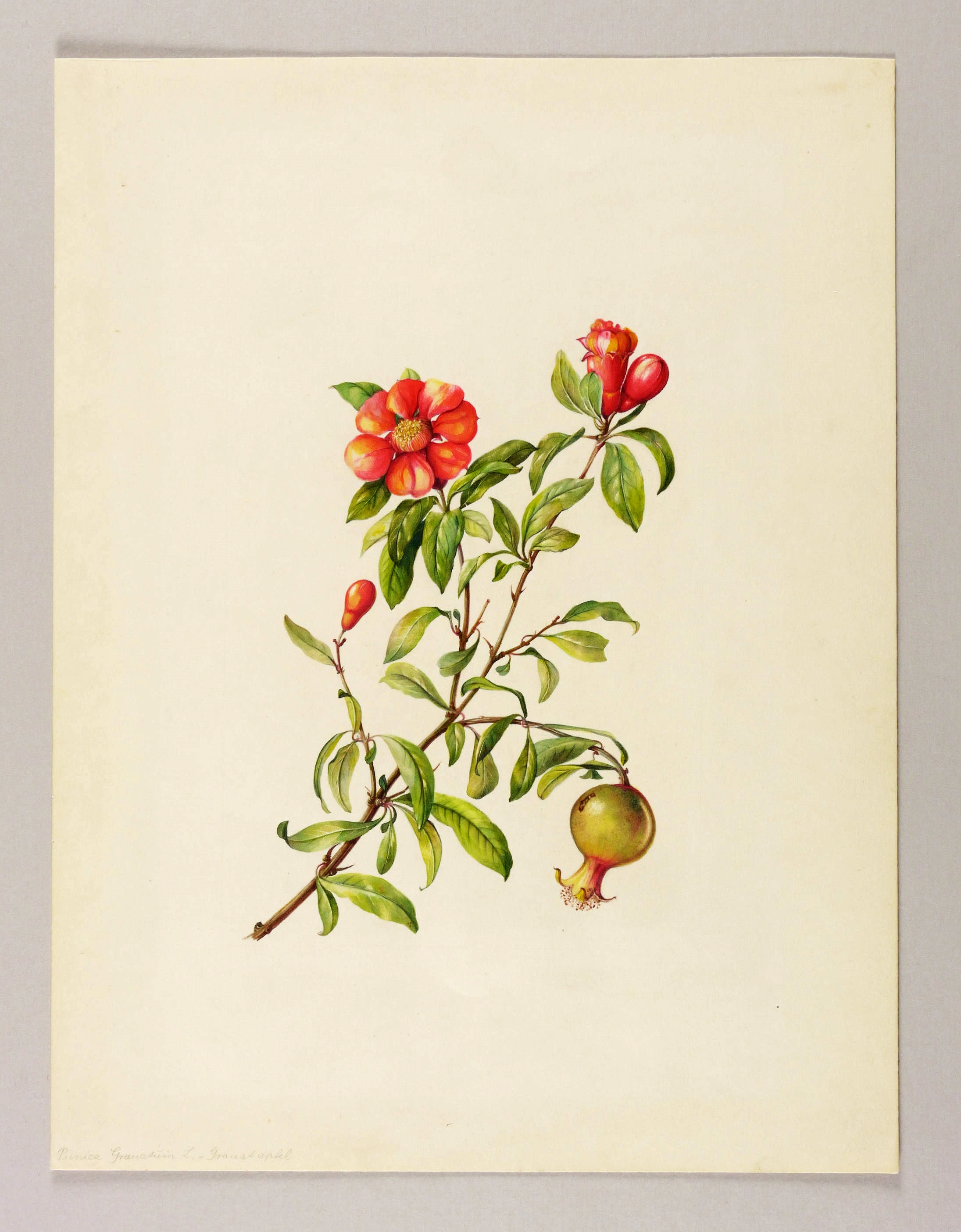 Links unten in Bleistift bezeichnet: "Punica Granatum L. = Granatapfel". Verso weiter: "Elsa M. Felsko". – Botanisches Aquarell von allerhöchster zeichnerischer wie koloristischer Qualität. – Mit schönem Kolorit und kräftigen Kontrsten erhalten. Sehr guter Zustand.