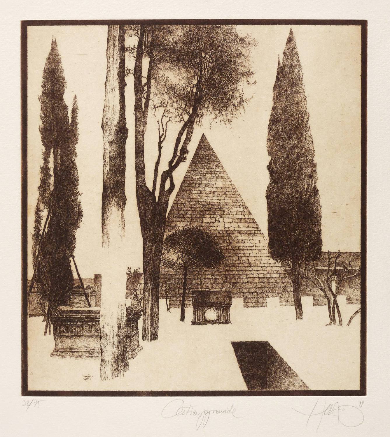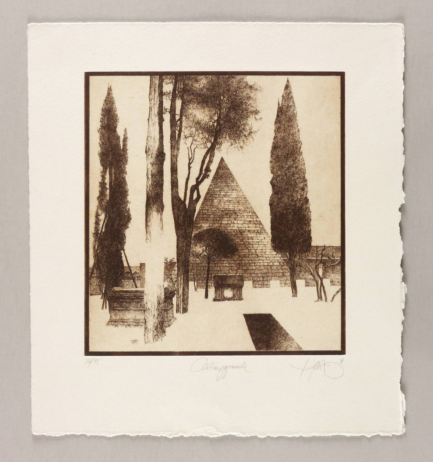 WVZ 178. – Rechts unten in Bleistift signiert und datiert: ″Herzog 78 [!]″. Links Auflagenbezeichnung: ″32/75″. Mittig Titel: ″Cestiuspyramide″. In der Platte links unten Signatur und Jahr: ″Herzog 1979″. Wasserzeichen der Hahnemühle. – Originalrandiges Exemplar. Im unteren Blattrand zentral etwas griffspurig. Insgesamt guter Zustand.