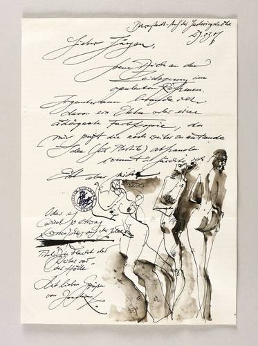 In schwarzer Feder Brief vom 29.3.2007 an Jürgen Steinfeld in Oldenburg: ″Darmstadt - Auf der Ludwigshöhe 29.03.07 / Lieber Jürgen, freue Dich an der Zeichnung im opulenten Rahmen. Irgendwann brauche ich davon ein Ekta oder eine adäquate Farbkopie, da mir sonst die noch weiter zu denkende Idee (für Plastik) abhanden kommt - fürchte ich. Eilt aber nicht. / Oder es wird so etwas Komisches aus der Idee: Titel: ″Die Flucht der Weiber vor der Hölle″ / Mit lieben Grüßen von Joachim K.″ Mittig Künstlerstempel: ″JOACHIM KUHLMANN VAGUS″. – Beiliegned der ebenfalls schön gestaltete Ausschnitt des zugehörigen Briefkuverts. – Original gefaltet. Sehr guter Zustand.